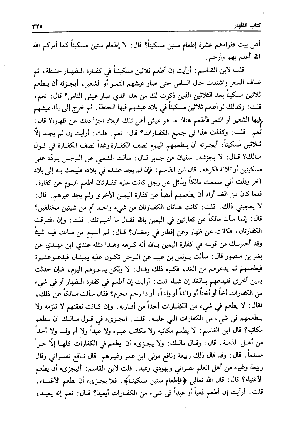قُلْتُ: أَرَأَيْتَ إنْ أَطْعَمَ فِي كَفَّارَةِ الظِّهَارِ أَوْ فِي شَيْءٍ مِنْ الْكَفَّارَاتِ أَخًا أَوْ أُخْتًا أَوْ وَالِدًا أَوْ وَلَدًا، أَوْ ذَا رَحِمٍ مَحْرَمٍ؟ فَقَالَ سَأَلْتُ مَالِكًا عَنْ ذَلِكَ، فَقَالَ: لَا يُطْعِمُ فِي شَيْءٍ مِنْ الْكَفَّارَاتِ أَحَدًا مِنْ أَقَارِبِهِ، وَإِنْ كَانَتْ نَفَقَتُهُمْ لَا تَلْزَمُهُ وَلَا يُطْعِمُهُمْ فِي شَيْءٍ مِنْ الْكَفَّارَاتِ الَّتِي عَلَيْهِ.