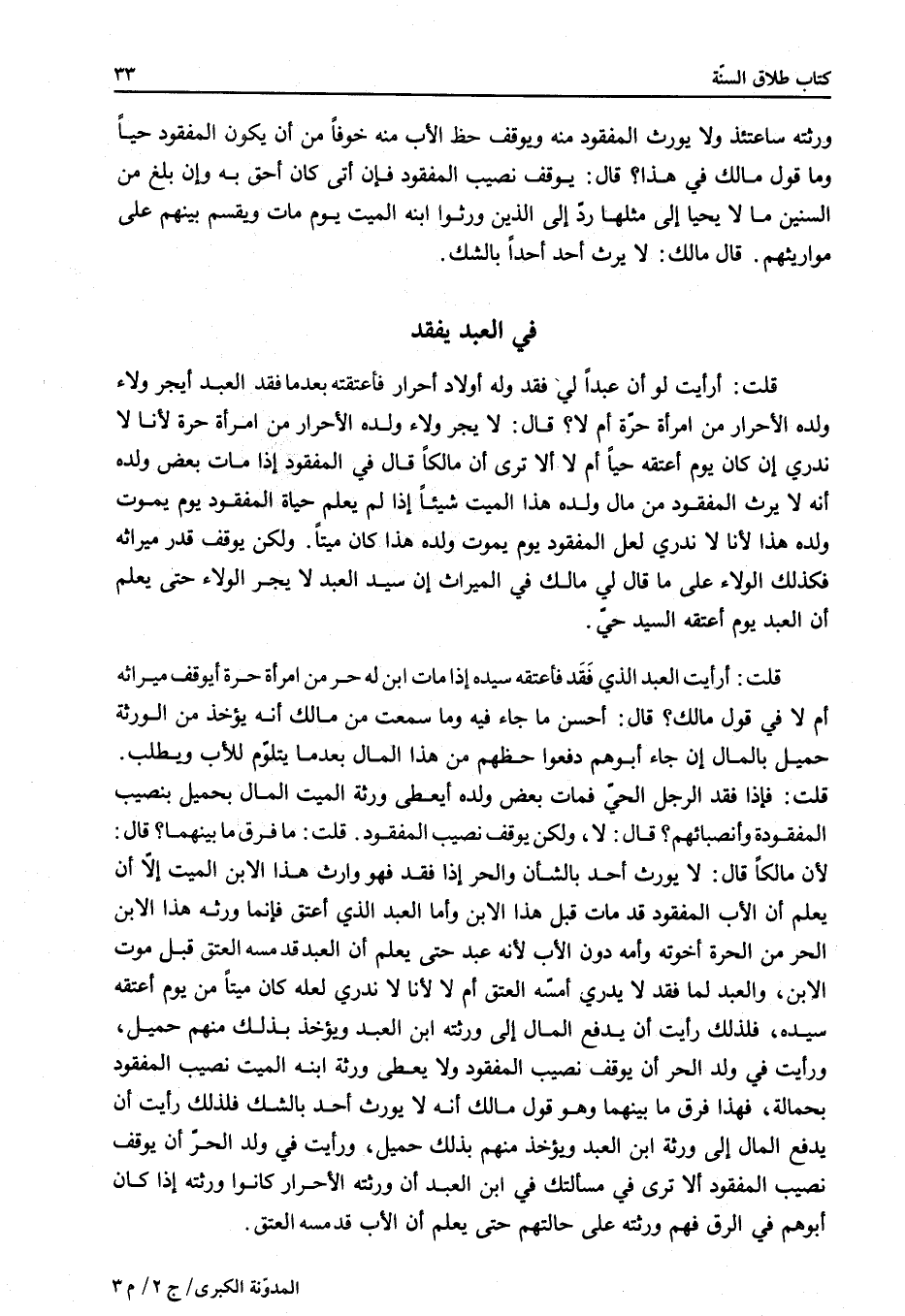 قَالَ: لِأَنَّ مَالِكًا قَالَ: لَا يُوَرَّثُ أَحَدٌ بِالشَّكِّ وَالْحُرُّ إذَا فُقِدَ فَهُوَ وَارِثٌ هَذَا الِابْنَ الْمَيِّتَ إلَّا أَنْ يُعْلَمَ أَنَّ الْأَبَ الْمَفْقُودَ قَدْ مَاتَ قَبْلَ هَذَا الِابْنِ وَأَمَّا الْعَبْدُ الَّذِي أُعْتِقَ فَإِنَّمَا وَرَّثَهُ هَذَا الِابْنُ الْحُرُّ مِنْ الْحُرَّةِ إخْوَتُهُ وَأُمُّهُ دُونَ الْأَبِ لِأَنَّهُ عَبْدٌ حَتَّى يُعْلَمَ أَنَّ الْعَبْدَ قَدْ مَسَّهُ الْعِتْقُ قَبْلَ مَوْتِ الِابْنِ، وَالْعَبْدُ لَمَّا فُقِدَ لَا يُدْرَى أَمَسَّهُ الْعِتْقُ أَمْ لَا لِأَنَّا لَا نَدْرِي لَعَلَّهُ كَانَ مَيِّتًا مِنْ يَوْمِ أَعْتَقَهُ سَيِّدُهُ، فَلِذَلِكَ رَأَيْتُ أَنْ يُدْفَعَ الْمَالُ إلَى وَرَثَةِ ابْنِ الْعَبْدِ وَيُؤْخَذُ بِذَلِكَ مِنْهُمْ حَمِيلٌ، وَرَأَيْتُ فِي وَلَدِ الْحُرِّ أَنْ يُوقَفَ نَصِيبُ الْمَفْقُودِ وَلَا يُعْطَى وَرَثَةُ ابْنِهِ الْمَيِّتِ نَصِيبَ الْمَفْقُودِ بِحَمَالَةٍ، فَهَذَا فَرْقُ مَا بَيْنَهُمَا وَهُوَ قَوْلُ مَالِكٍ أَنَّهُ لَا يُوَرَّثُ أَحَدٌ بِالشَّكِّ فَلِذَلِكَ رَأَيْتُ أَنْ يُدْفَعَ الْمَالُ إلَى وَرَثَةِ ابْنِ الْعَبْدِ وَيُؤْخَذَ مِنْهُمْ بِذَلِكَ حَمِيلٌ، وَرَأَيْتُ فِي وَلَدِ الْحُرِّ أَنْ يُوقَفَ نَصِيبُ الْمَفْقُودِ، أَلَا تَرَى فِي مَسْأَلَتِكَ فِي ابْنِ الْعَبْدِ أَنَّ وَرَثَتَهُ الْأَحْرَارَ كَانُوا وَرَثَتَهُ إذَا كَانَ أَبُوهُمْ فِي الرِّقِّ فَهُمْ وَرَثَتُهُ عَلَى حَالَتِهِمْ. حَتَّى يُعْلَمَ أَنَّ الْأَبَ قَدْ مَسَّهُ الْعِتْقُ.