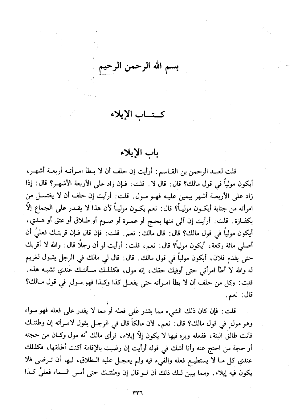 بَابُ الْإِيلَاءِ قُلْتُ لِعَبْدِ الرَّحْمَنِ بْنِ الْقَاسِمِ: أَرَأَيْتَ إنْ حَلَفَ أَنْ لَا يَطَأَ امْرَأَتَهُ أَرْبَعَةَ أَشْهُرٍ أَيَكُونُ مُولِيًا فِي قَوْلِ مَالِكٍ؟ قَالَ: قَالَ لَا.