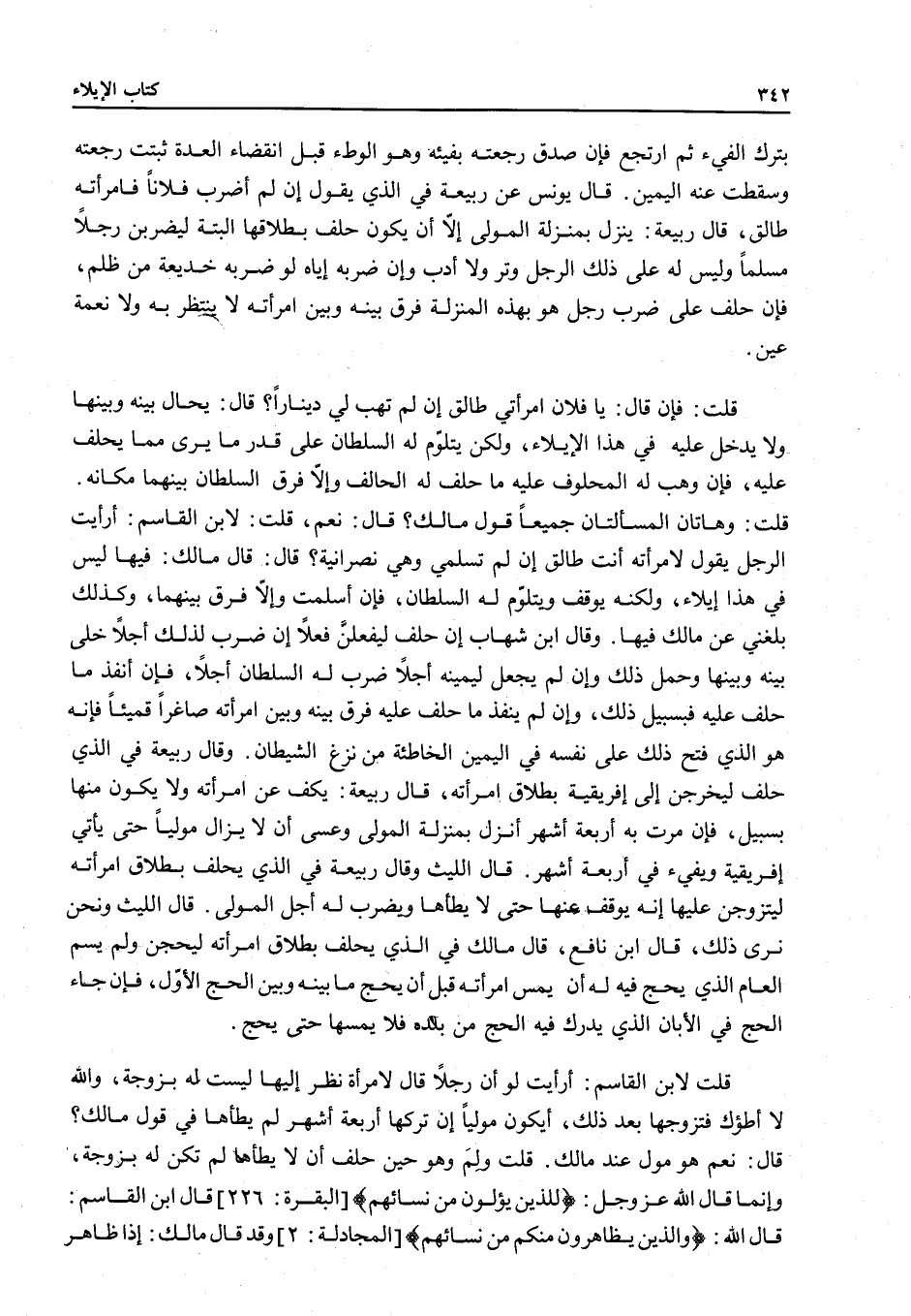 قُلْتُ وَلِمَ وَهُوَ حِينَ حَلَفَ أَنْ لَا يَطَأَهَا لَمْ تَكُنْ لَهُ بِزَوْجَةٍ، وَإِنَّمَا قَالَ اللَّهُ عَزَّ وَجَلَّ: {لِلَّذِينَ يُؤْلُونَ مِنْ نِسَائِهِمْ} [البقرة: 226] قَالَ ابْنُ الْقَاسِمِ: قَالَ اللَّهُ: {الَّذِينَ يُظَاهِرُونَ مِنْكُمْ مِنْ نِسَائِهِمْ} [المجادلة: 2] وَقَدْ قَالَ مَالِكٌ: إذَا ظَاهَرَ