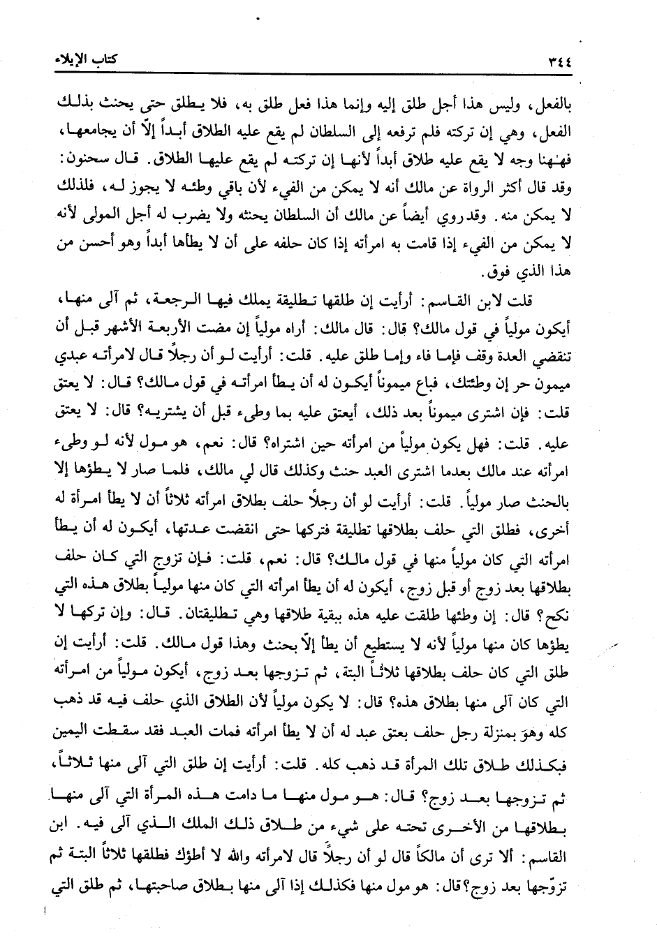 قُلْتُ لِابْنِ الْقَاسِمِ: أَرَأَيْتَ إنْ طَلَّقَهَا تَطْلِيقَةً يَمْلِكُ فِيهَا الرَّجْعَةَ، ثُمَّ آلَى مِنْهَا، أَيَكُونُ مُولِيًا فِي قَوْلِ مَالِكٍ؟ قَالَ: قَالَ مَالِكٌ: أَرَاهُ مُولِيًا إنْ مَضَتْ الْأَرْبَعَةُ الْأَشْهُرُ قَبْلَ أَنْ تَنْقَضِيَ الْعِدَّةُ وُقِفَ فَإِمَّا فَاءَ وَإِمَّا طُلِّقَ عَلَيْهِ.