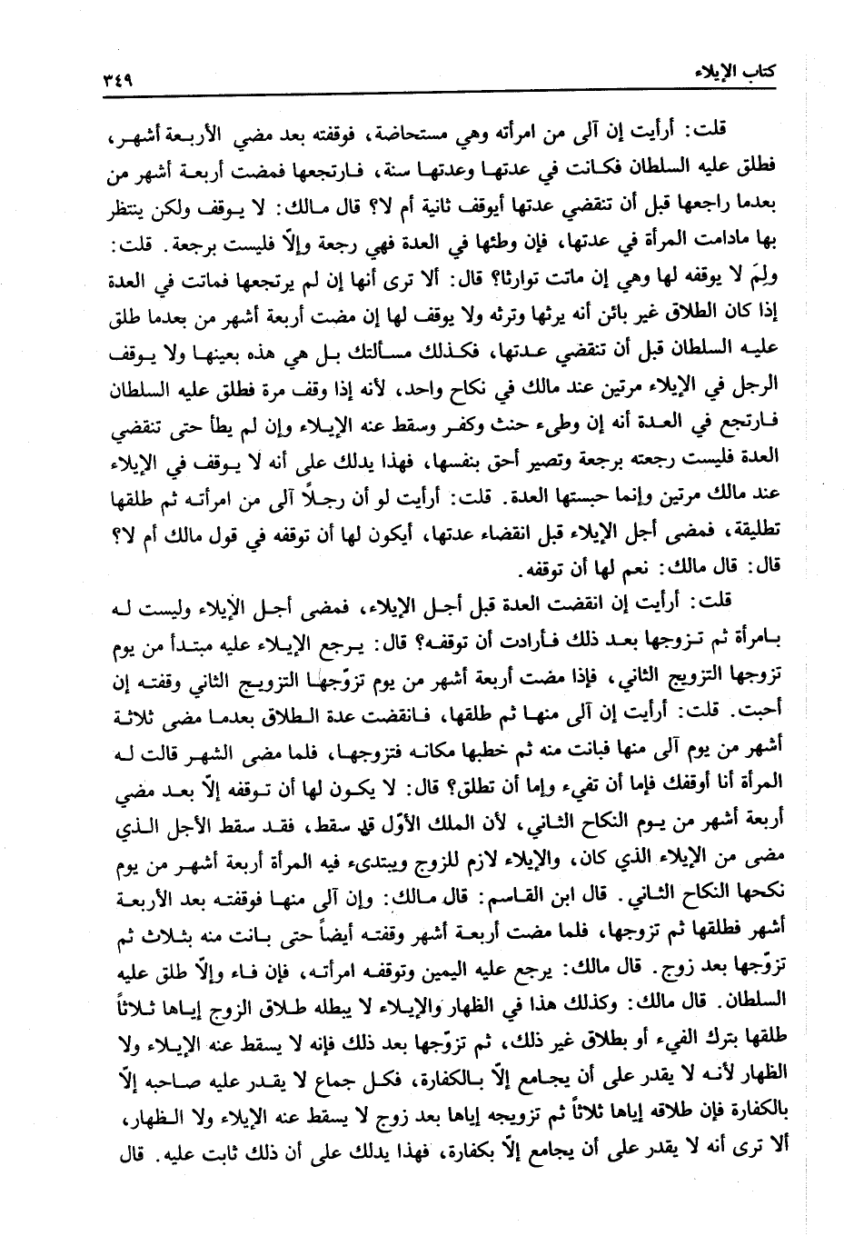 قَالَ: أَلَا تَرَى أَنَّهَا إنْ لَمْ يَرْتَجِعْهَا فَمَاتَتْ فِي الْعِدَّةِ إذَا كَانَ الطَّلَاقُ غَيْرَ بَائِنٍ أَنَّهُ يَرِثُهَا وَتَرِثُهُ وَلَا يُوقَفُ لَهَا إنْ مَضَتْ أَرْبَعَةُ أَشْهُرٍ مِنْ بَعْدِ مَا طَلَّقَ عَلَيْهِ السُّلْطَانُ قَبْلَ أَنْ تَنْقَضِيَ عِدَّتُهَا، فَكَذَلِكَ مَسْأَلَتُكَ بَلْ هِيَ هَذِهِ بِعَيْنِهَا، وَلَا يُوقَفُ الرَّجُلُ فِي الْإِيلَاءِ مَرَّتَيْنِ عِنْدَ مَالِكٍ فِي نِكَاحٍ وَاحِدٍ، لِأَنَّهُ إذَا وُقِفَ مَرَّةً فَطَلَّقَ عَلَيْهِ السُّلْطَانُ فَارْتَجَعَ فِي الْعِدَّةِ أَنَّهُ إنْ وَطِئَ حَنِثَ وَكَفَّرَ وَسَقَطَ عَنْهُ الْإِيلَاءُ وَإِنْ لَمْ يَطَأْ حَتَّى تَنْقَضِيَ الْعِدَّةُ فَلَيْسَتْ رَجَعْتُهُ بِرَجْعَةٍ وَتَصِيرُ أَحَقَّ بِنَفْسِهَا، فَهَذَا يَدُلُّكَ عَلَى أَنَّهُ لَا يُوقَفُ فِي الْإِيلَاءِ عِنْدَ مَالِكٍ مَرَّتَيْنِ وَإِنَّمَا حَبَسَتْهَا الْعِدَّةُ.