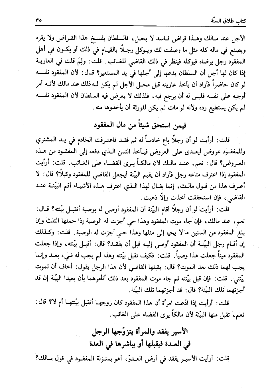 الْأَجَلُ عِنْدَ مَالِكٍ وَهَذَا قِرَاضٌ فَاسِدٌ لَا يَحِلُّ، فَالسُّلْطَانُ يَفْسَخُ هَذَا الْقِرَاضَ وَلَا يُقِرُّهُ وَيَصْنَعُ فِي مَالِهِ كُلِّهِ مِثْلَ مَا وَصَفْتُ لَكَ وَيُوَكِّلُ رَجُلًا بِالْقِيَامِ فِي ذَلِكَ أَوْ يَكُونُ فِي أَهْلِ الْمَفْقُودِ رَجُلٌ يَرْضَاهُ فَيُوَكِّلُهُ فَيَنْظُرُ فِي ذَلِكَ الْقَاضِي لِلْغَائِبِ، قُلْتُ: وَلِمَ قُلْتَ فِي الْعَارِيَّةِ إذَا كَانَ لَهَا أَجَلٌ أَنَّ السُّلْطَانَ يَدْعُهَا إلَى أَجَلِهَا فِي يَدِ الْمُسْتَعِيرِ؟