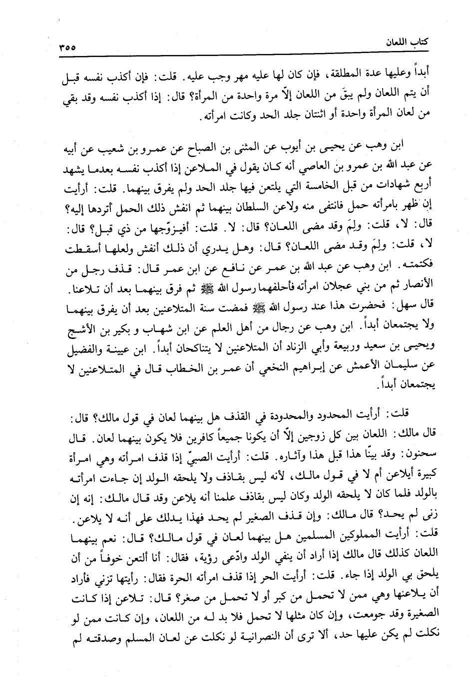ابْنُ وَهْبٍ عَنْ عَبْدِ اللَّهِ بْنِ عُمَرَ عَنْ نَافِعٍ عَنْ ابْنِ عُمَرَ قَالَ: «قَذَفَ رَجُلٌ مِنْ الْأَنْصَارِ ثَمَّ مِنْ بَنِي عَجْلَانَ امْرَأَتَهُ فَأَحْلَفَهُمَا رَسُولُ اللَّهِ - صَلَّى اللَّهُ عَلَيْهِ وَسَلَّمَ - ثُمَّ فَرَّقَ بَيْنَهُمَا بَعْدَ أَنْ تَلَاعَنَا» .