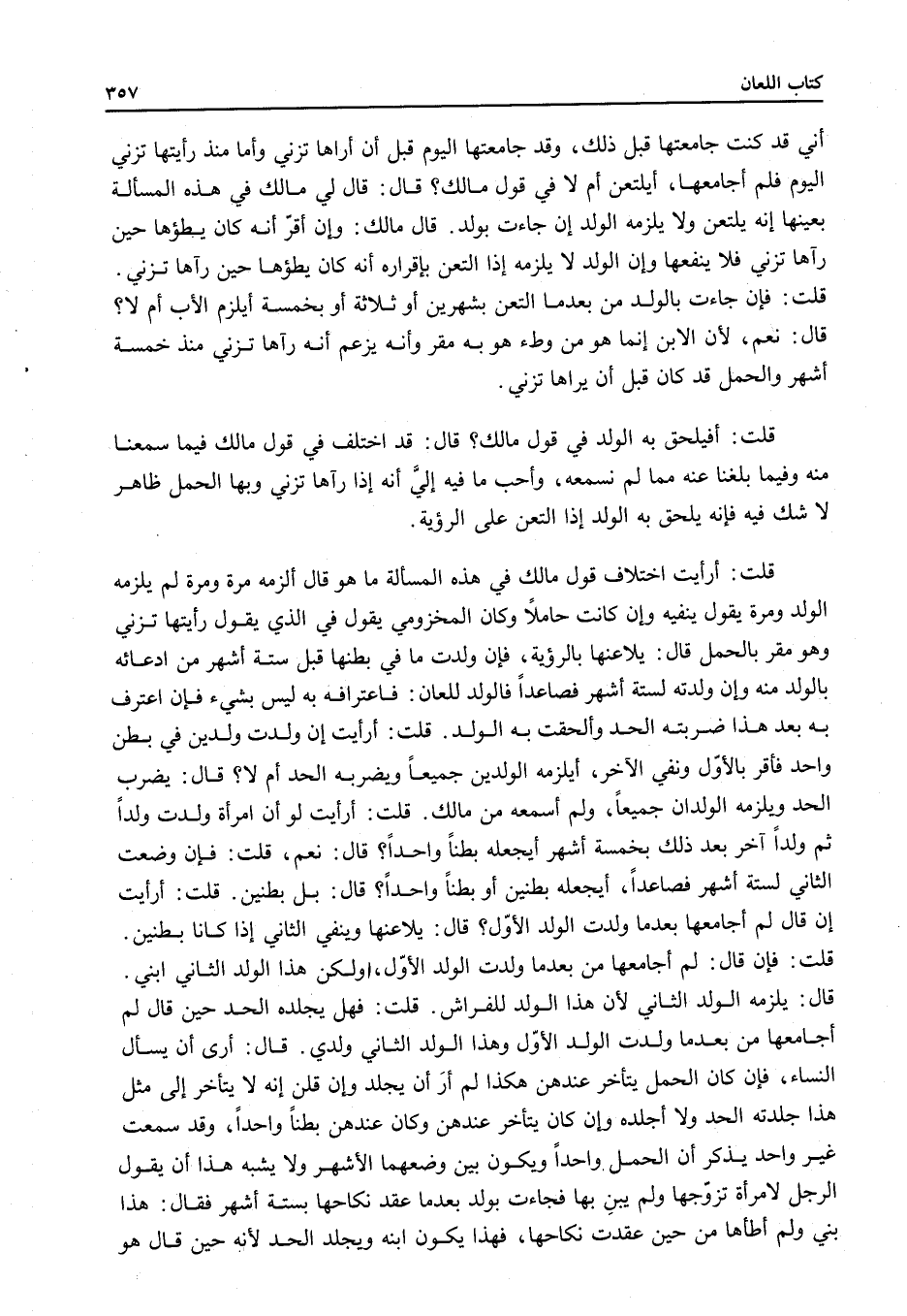 أَنِّي قَدْ كُنْتُ جَامَعْتُهَا قَبْلَ ذَلِكَ، وَقَدْ جَامَعْتُهَا الْيَوْمَ قَبْلَ أَنْ أَرَاهَا تَزْنِي وَأَمَّا مُنْذُ رَأَيْتهَا تَزْنِي الْيَوْمَ فَلَمْ أُجَامِعْهَا، أَيَلْتَعِنُ أَمْ لَا فِي قَوْلِ مَالِكٍ؟