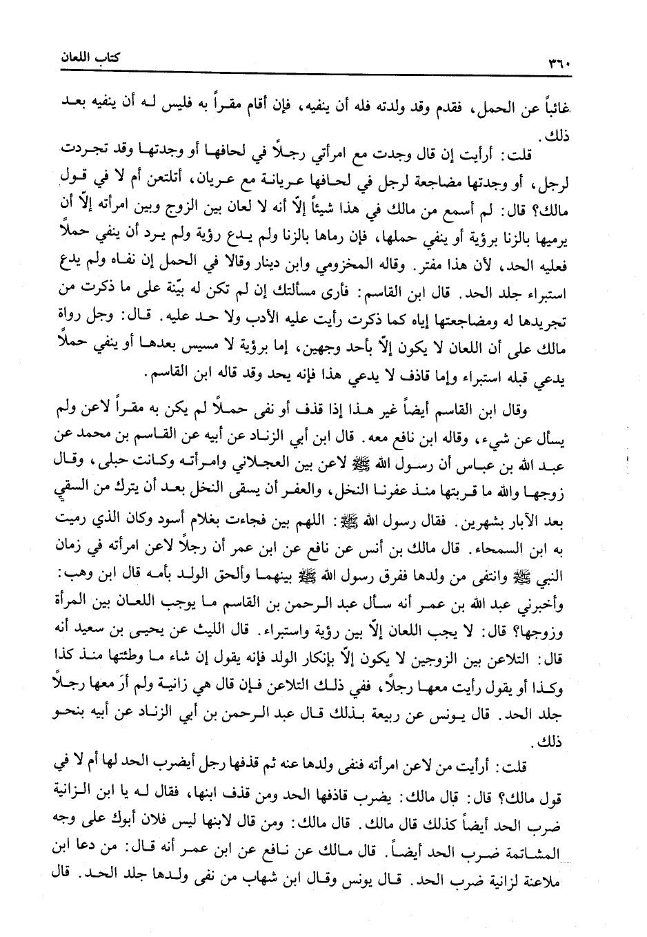 قَالَ مَالِكُ بْنُ أَنَسٍ عَنْ نَافِعٍ عَنْ ابْنِ عُمَرَ «أَنَّ رَجُلًا لَاعَنَ امْرَأَتَهُ فِي زَمَانِ النَّبِيِّ - صَلَّى اللَّهُ عَلَيْهِ وَسَلَّمَ - وَانْتَفَى مِنْ وَلَدِهَا فَفَرَّقَ رَسُولُ اللَّهِ - صَلَّى اللَّهُ عَلَيْهِ وَسَلَّمَ - بَيْنَهُمَا وَأَلْحَقَ الْوَلَدَ بِأُمِّهِ» قَالَ ابْنُ وَهْبٍ: وَأَخْبَرَنِي عَبْدُ اللَّهِ بْنُ عُمَرَ أَنَّهُ سَأَلَ عَبْدَ الرَّحْمَنِ بْنَ الْقَاسِمِ مَا يُوجِبُ اللِّعَانَ بَيْنَ الْمَرْأَةِ وَزَوْجِهَا؟