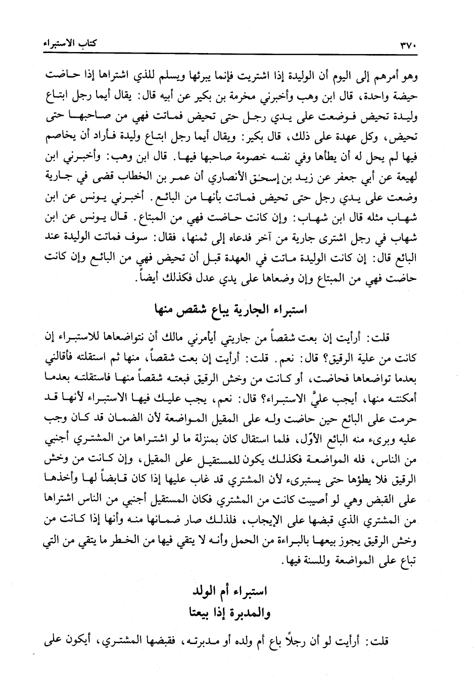 قُلْتُ: أَرَأَيْتَ إنْ بِعْتُ شِقْصًا مِنْ جَارِيَتِي أَيَأْمُرُنِي مَالِكٌ أَنْ نَتَوَاضَعَاهَا لِلِاسْتِبْرَاءِ إنْ كَانَتْ مِنْ عِلْيَةِ الرَّقِيقِ؟