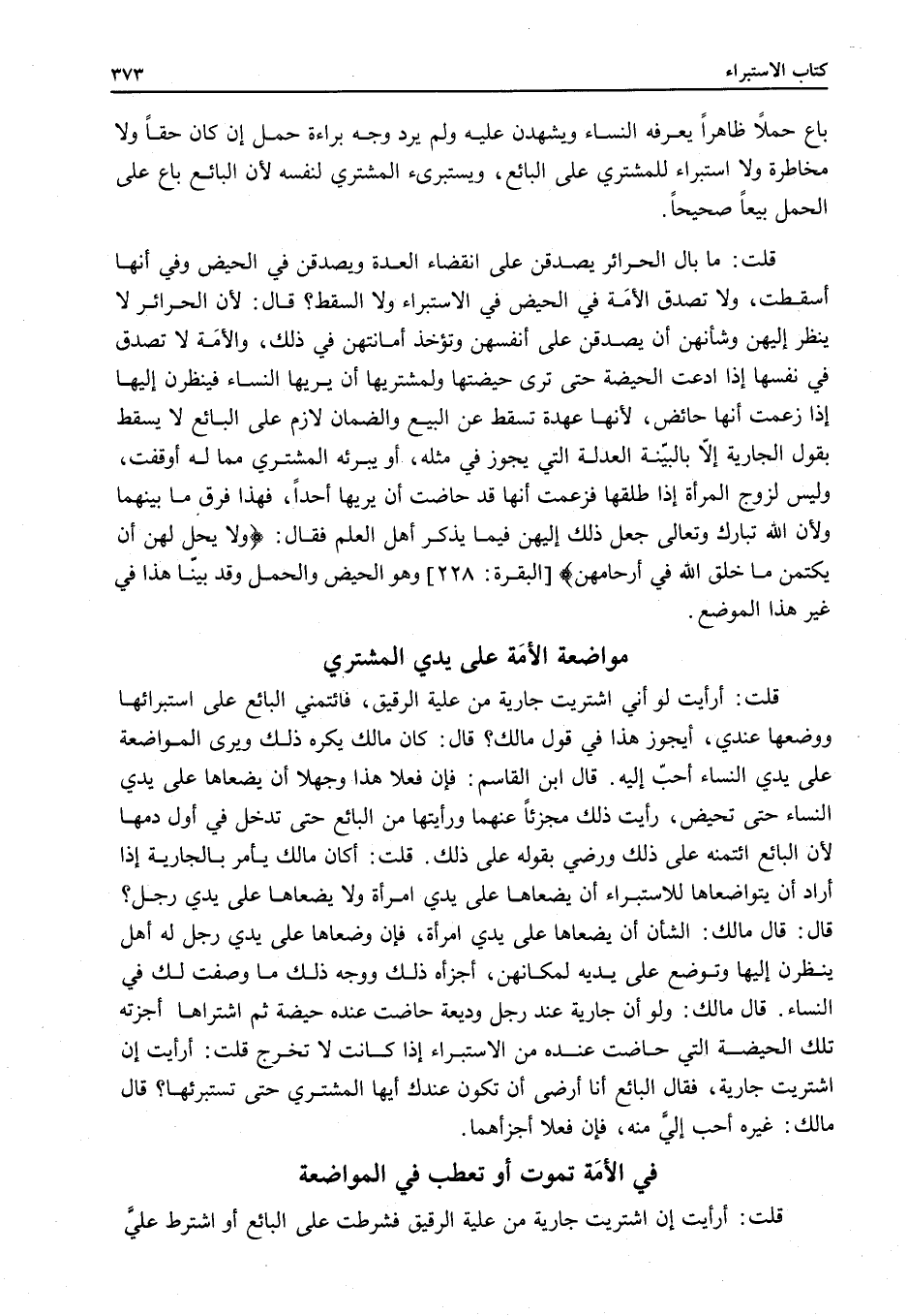 قُلْتُ: أَكَانَ مَالِكٌ يَأْمُرُ بِالْجَارِيَةِ إذَا أَرَادَ أَنْ يَتَوَاضَعَاهَا لِلِاسْتِبْرَاءِ أَنْ يَضَعَاهَا عَلَى يَدَيْ امْرَأَةٍ وَلَا يَضَعَاهَا عَلَى يَدَيْ رَجُلٍ؟
