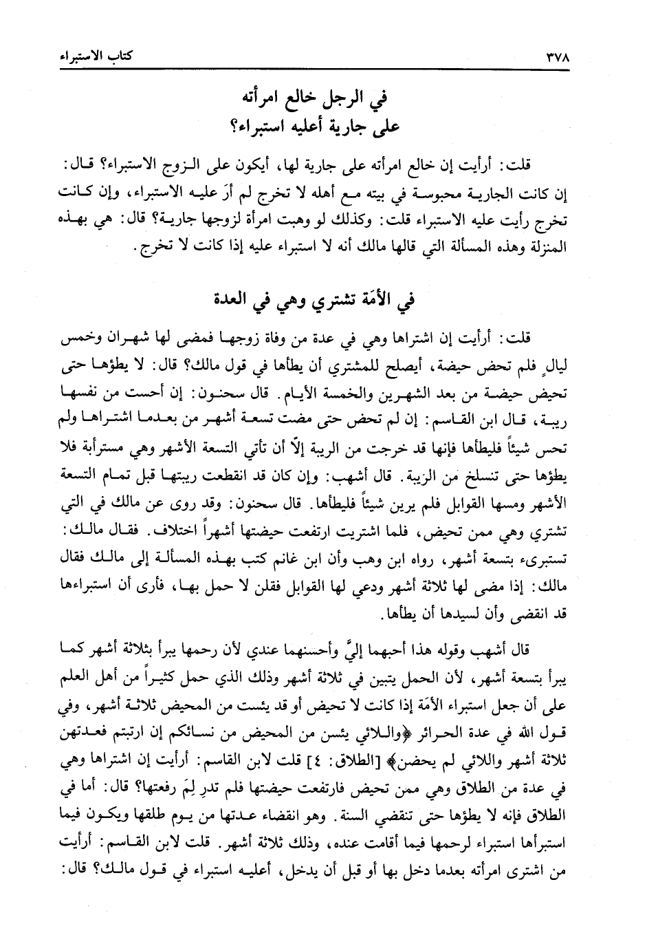 قُلْتُ لِابْنِ الْقَاسِمِ: أَرَأَيْتَ مَنْ اشْتَرَى امْرَأَتَهُ بَعْدَمَا دَخَلَ بِهَا أَوْ قَبْلَ أَنْ يَدْخُلَ، أَعَلَيْهِ اسْتِبْرَاءٌ فِي قَوْلِ مَالِكٍ؟