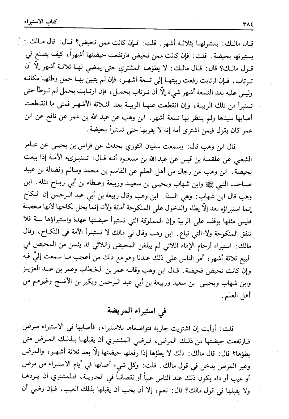 ابْنُ وَهْبٍ وَقَالَ رَبِيعَةُ بْنُ أَبِي عَبْدِ الرَّحْمَنِ: إنَّ النِّكَاحَ إنَّمَا اسْتِبْرَاؤُهُ بَعْدَ الْإِيطَاءِ وَالدُّخُولِ عَلَى الْمَنْكُوحَةِ أَمَانَةٌ وَلِأَنَّهُ إنَّمَا يَحِلُّ نِكَاحُهَا لِأَنَّهَا مُحْصَنَةٌ فَلَيْسَ مِثْلُهَا يُوقَفُ عَلَى الرِّيبَةِ وَإِنَّ الْمَمْلُوكَةَ الَّتِي تُسْتَبْرَأُ حَيْضَتُهَا عُهْدَةٌ وَاسْتِبْرَاؤُهَا سُنَّةٌ فَلَا تَتَّفِقُ الْمَنْكُوحَةُ وَلَا الَّتِي تُبَاعُ.