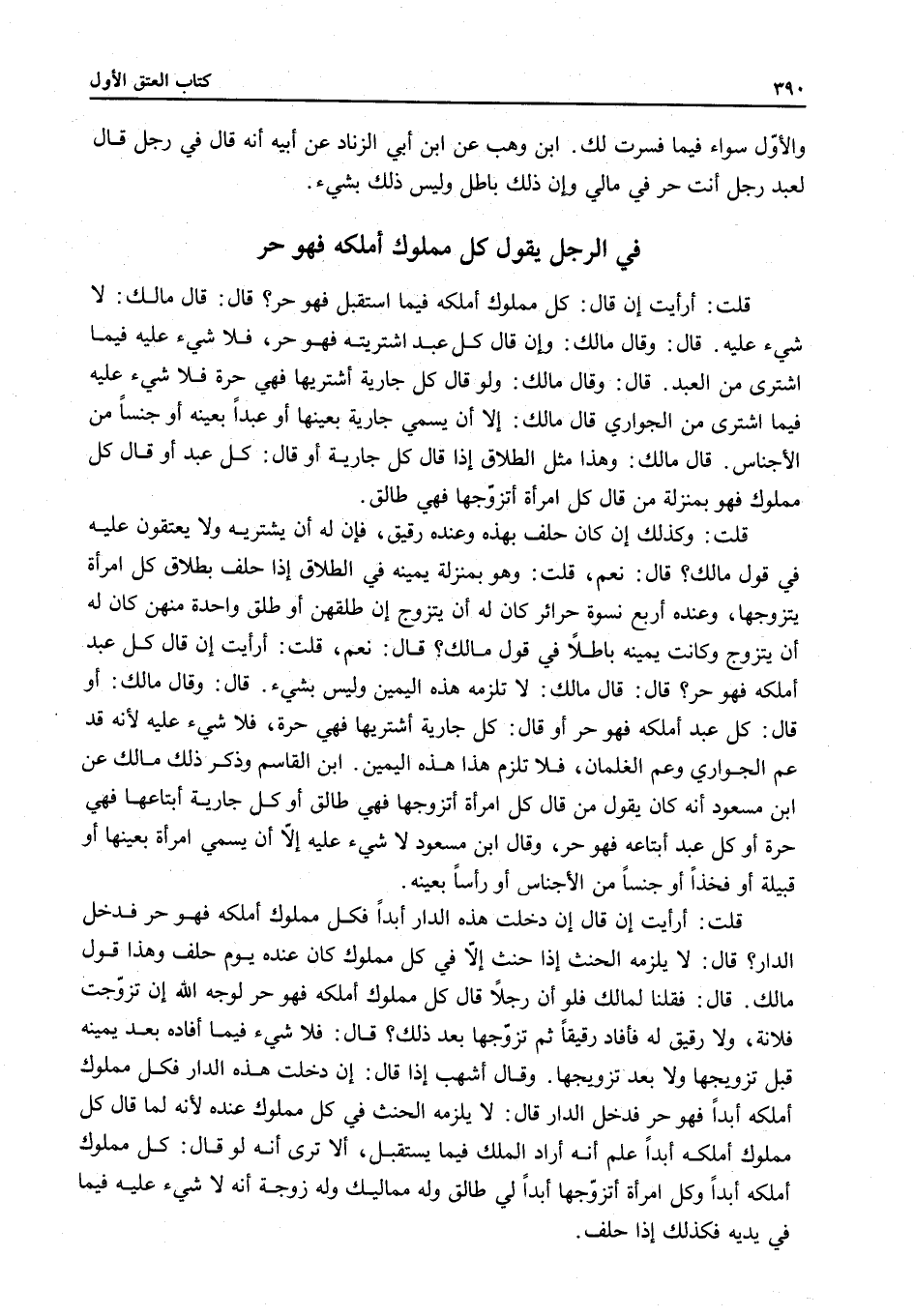 ابْنُ الْقَاسِمِ وَذَكَرَ ذَلِكَ مَالِكٌ عَنْ ابْنِ مَسْعُودٍ أَنَّهُ كَانَ يَقُولُ: مَنْ قَالَ: كُلُّ امْرَأَةٍ أَتَزَوَّجُهَا فَهِيَ طَالِقٌ أَوْ كُلُّ جَارِيَةٍ أَبْتَاعُهَا فَهِيَ حُرَّةٌ أَوْ كُلُّ عَبْدٍ أَبْتَاعُهُ فَهُوَ حُرٌّ، وَقَالَ ابْنُ مَسْعُودٍ لَا شَيْءَ عَلَيْهِ إلَّا أَنْ يُسَمِّيَ امْرَأَةً بِعَيْنِهَا أَوْ قَبِيلَةً أَوْ فَخْذًا أَوْ جِنْسًا مِنْ الْأَجْنَاسِ أَوْ رَأْسًا بِعَيْنِهِ.