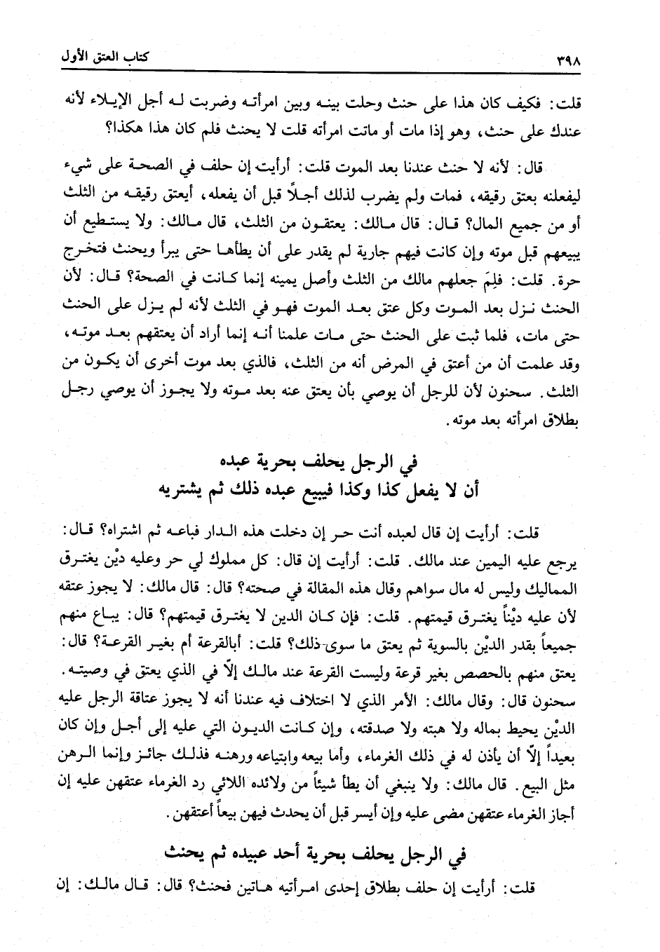 سَحْنُونٌ قَالَ: وَقَالَ مَالِكٌ: الْأَمْرُ الَّذِي لَا اخْتِلَافَ فِيهِ عِنْدَنَا أَنَّهُ لَا يَجُوزُ عَتَاقَةُ الرَّجُلِ عَلَيْهِ الدَّيْنُ يُحِيطُ بِمَالِهِ وَلَا هِبَتُهُ وَلَا صَدَقَتُهُ، وَإِنْ كَانَتْ الدُّيُونُ الَّتِي عَلَيْهِ إلَى أَجَلٍ وَإِنْ كَانَ بَعِيدًا إلَّا أَنْ يَأْذَنَ لَهُ فِي ذَلِكَ الْغُرَمَاءُ، وَأَمَّا بَيْعُهُ وَابْتِيَاعُهُ وَرَهْنُهُ فَذَلِكَ جَائِزٌ وَإِنَّمَا الرَّهْنُ مِثْلُ الْبَيْعِ.