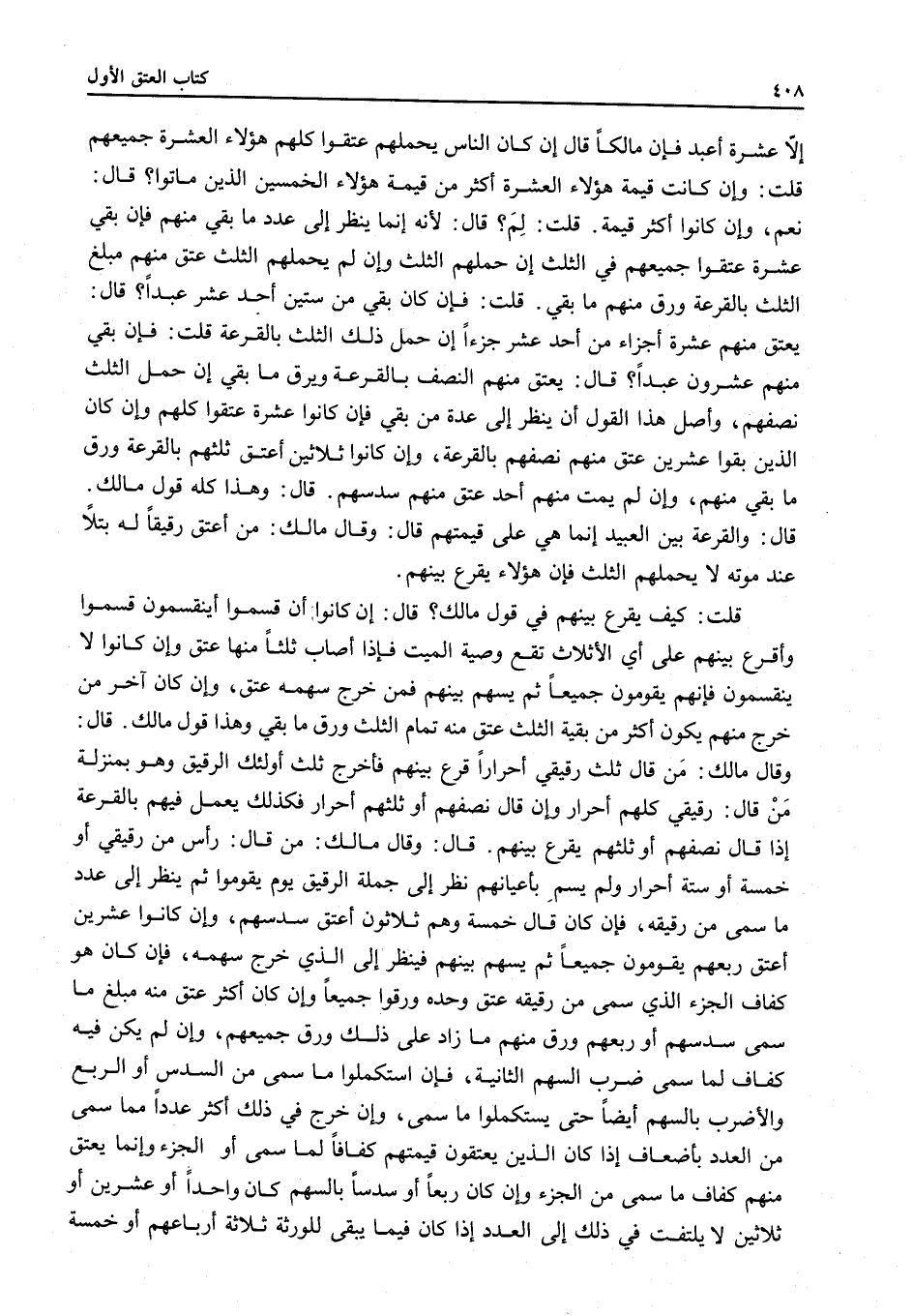 قَالَ: وَقَالَ مَالِكٌ: مَنْ قَالَ: رَأْسٌ مِنْ رَقِيقِي أَوْ خَمْسَةٌ أَوْ سِتَّةٌ أَحْرَارٌ وَلَمْ يُسَمِّ بِأَعْيَانِهِمْ نُظِرَ إلَى جُمْلَةِ الرَّقِيقِ يَوْمَ يُقَوَّمُوا ثُمَّ يُنْظَرُ إلَى عَدَدِ مَا سَمَّى مِنْ رَقِيقِهِ، فَإِنْ كَانَ قَالَ: خَمْسَةٌ، وَهُمْ ثَلَاثُونَ أُعْتِقَ سُدُسُهُمْ، وَإِنْ كَانُوا عِشْرِينَ أُعْتِقَ رُبْعُهُمْ يُقَوَّمُونَ جَمِيعًا ثُمَّ يُسْهَمُ بَيْنَهُمْ فَيُنْظَرُ إلَى الَّذِي خَرَجَ سَهْمُهُ، فَإِنْ كَانَ هُوَ كَفَافُ الْجُزْءِ الَّذِي سَمَّى مِنْ رَقِيقِهِ عَتَقَ وَحْدَهُ وَرَقُّوا جَمِيعًا، وَإِنْ كَانَ أَكْثَرَ عَتَقَ مِنْهُ مَبْلَغُ مَا سَمَّى سُدُسَهُمْ أَوْ رُبْعَهُمْ وَرَقَّ مِنْهُمْ مَا زَادَ عَلَى ذَلِكَ وَرَقَّ جَمِيعُهُمْ، وَإِنْ لَمْ يَكُنْ فِيهِ كَفَافٌ لِمَا سَمَّى ضَرَبَ السَّهْمَ الثَّانِيَةَ، فَإِنْ اسْتَكْمَلُوا مَا سَمَّى مِنْ السُّدُسِ أَوْ الرُّبْعِ وَإِلَّا ضُرِبَ بِالسَّهْمِ أَيْضًا حَتَّى يَسْتَكْمِلُوا مَا سَمَّى، وَإِنْ خَرَجَ فِي ذَلِكَ أَكْثَرُ عَدَدًا مِمَّا سَمَّى مِنْ الْعَدَدِ بِأَضْعَافٍ إذَا كَانَ الَّذِينَ يُعْتَقُونَ قِيمَتُهُمْ كَفَافًا لِمَا سَمَّى أَوْ الْجُزْءُ وَإِنَّمَا يُعْتَقُ مِنْهُمْ كَفَافُ مَا سَمَّى مِنْ الْجُزْءِ وَإِنْ كَانَ رُبْعًا أَوْ سُدُسًا بِالسَّهْمِ كَانَ وَاحِدًا أَوْ عِشْرِينَ أَوْ ثَلَاثِينَ لَا يُلْتَفَتُ فِي ذَلِكَ إلَى الْعَدَدِ إذَا كَانَ فِيمَا يَبْقَى لِلْوَرَثَةِ ثَلَاثَةُ أَرْبَاعِهِمْ أَوْ خَمْسَةُ