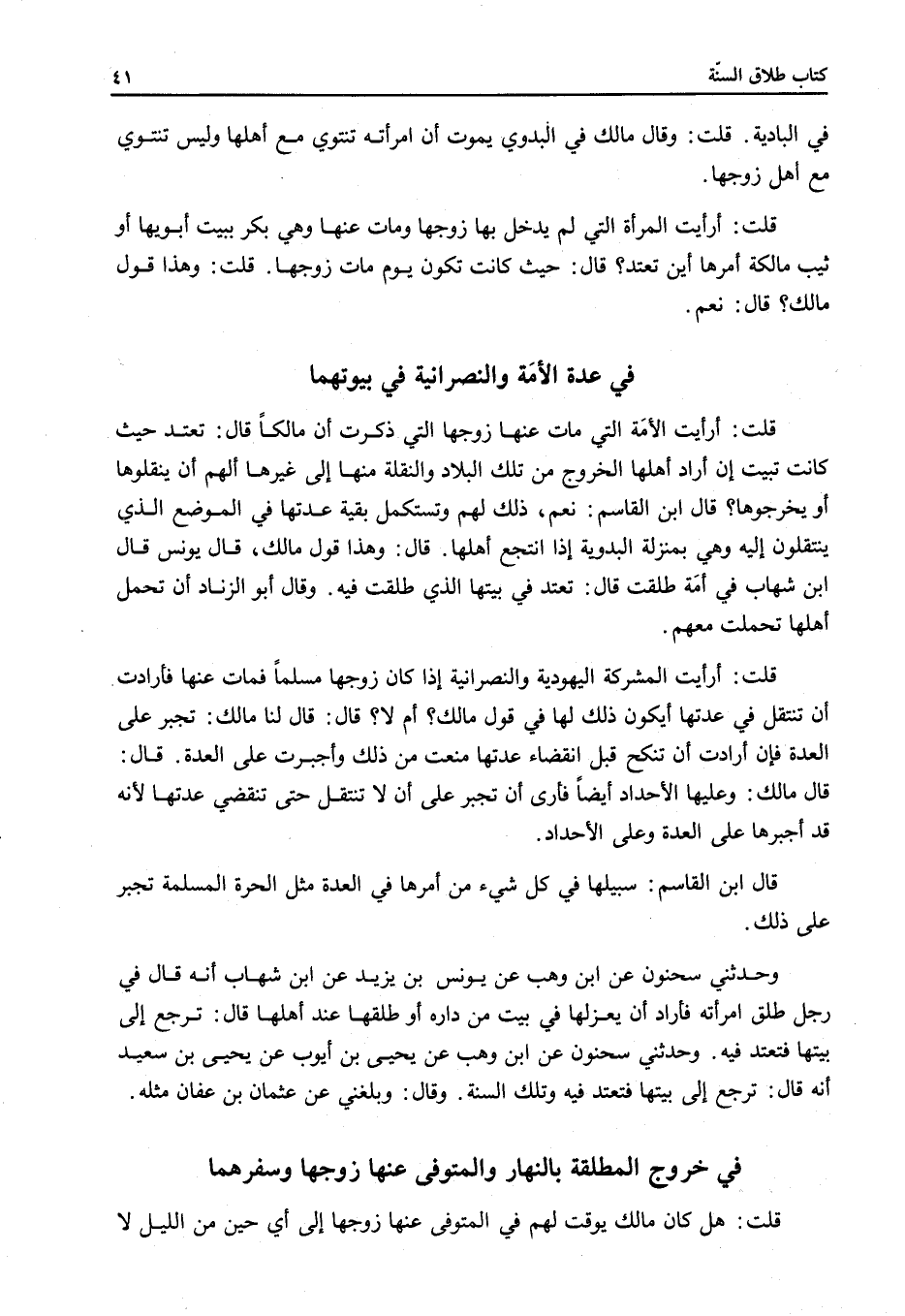 فِي خُرُوجِ الْمُطَلَّقَةِ بِالنَّهَارِ وَالْمُتَوَفَّى عَنْهَا زَوْجُهَا وَسَفَرِهِمَا قُلْتُ: هَلْ كَانَ مَالِكٌ يُوَقِّتُ لَهُمْ فِي الْمُتَوَفَّى عَنْهَا زَوْجُهَا إلَى أَيِّ حِينٍ مِنْ اللَّيْلِ لَا