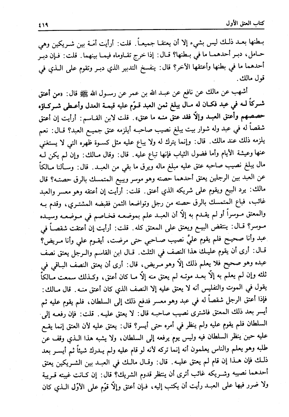 أَشْهَبُ عَنْ مَالِكٍ عَنْ نَافِعٍ عَنْ عَبْدِ اللَّهِ بْنِ عُمَرَ عَنْ رَسُولِ اللَّهِ - صَلَّى اللَّهُ عَلَيْهِ وَسَلَّمَ - قَالَ: «مَنْ أَعْتَقَ شِرْكًا لَهُ فِي عَبْدٍ فَكَانَ لَهُ مَالٌ يَبْلُغُ ثَمَنَ الْعَبْدِ قُوِّمَ عَلَيْهِ قِيمَةُ الْعَدْلِ وَأُعْطِيَ شُرَكَاؤُهُ حِصَصَهُمْ وَأُعْتِقَ الْعَبْدُ وَإِلَّا فَقَدْ عَتَقَ مِنْهُ مَا عَتَقَ» .