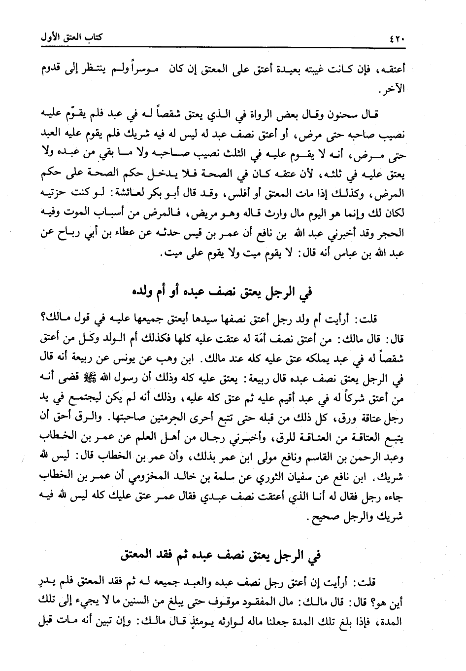 فِي الرَّجُلِ يُعْتِقُ نِصْفَ عَبْدِهِ أَوْ أُمَّ وَلَدِهِ قُلْتُ: أَرَأَيْتَ أُمَّ وَلَدِ رَجُلٍ أَعْتَقَ نِصْفَهَا سَيِّدُهَا أَيُعْتَقُ جَمِيعُهَا عَلَيْهِ فِي قَوْلِ مَالِكٍ؟