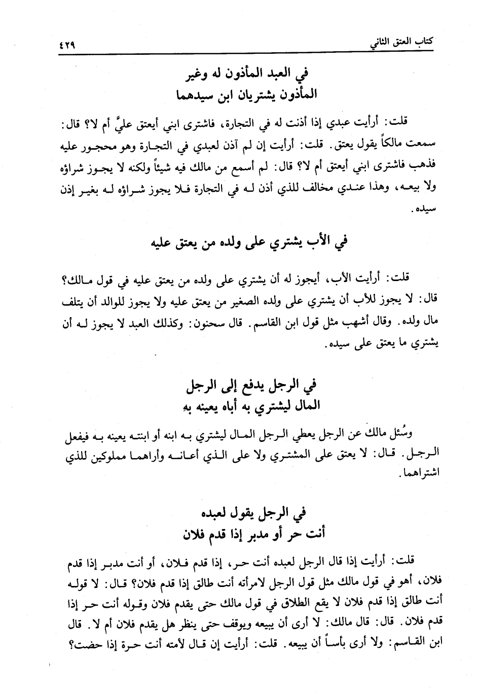 قَالَ: لَمْ أَسْمَعْ مِنْ مَالِكٍ فِيهِ شَيْئًا وَلَكِنَّهُ لَا يَجُوزُ شِرَاؤُهُ وَلَا بَيْعُهُ، وَهَذَا عِنْدِي مُخَالِفٌ لِلَّذِي أَذِنَ لَهُ فِي التِّجَارَةِ فَلَا يَجُوزُ شِرَاؤُهُ لَهُ بِغَيْرِ إذْنِ سَيِّدِهِ.