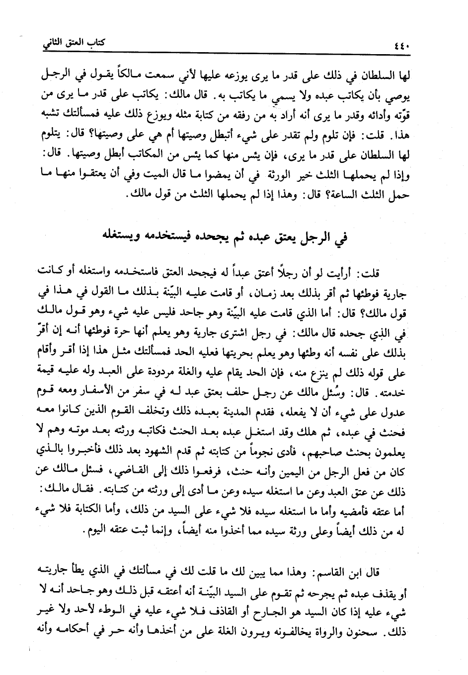فِي الرَّجُلِ يُعْتِقُ عَبْدَهُ ثُمَّ يَجْحَدُهُ فَيَسْتَخْدِمُهُ وَيَسْتَغِلُّهُ قُلْتُ: أَرَأَيْتَ لَوْ أَنَّ رَجُلًا أَعْتَقَ عَبْدًا لَهُ فَيَجْحَدُ الْعِتْقَ فَاسْتَخْدَمَهُ وَاسْتَغَلَّهُ أَوْ كَانَتْ جَارِيَةً فَوَطِئَهَا ثُمَّ أَقَرَّ بِذَلِكَ بَعْدَ زَمَانٍ، أَوْ قَامَتْ عَلَيْهِ الْبَيِّنَةُ بِذَلِكَ مَا الْقَوْلُ فِي هَذَا فِي قَوْلِ مَالِكٍ؟