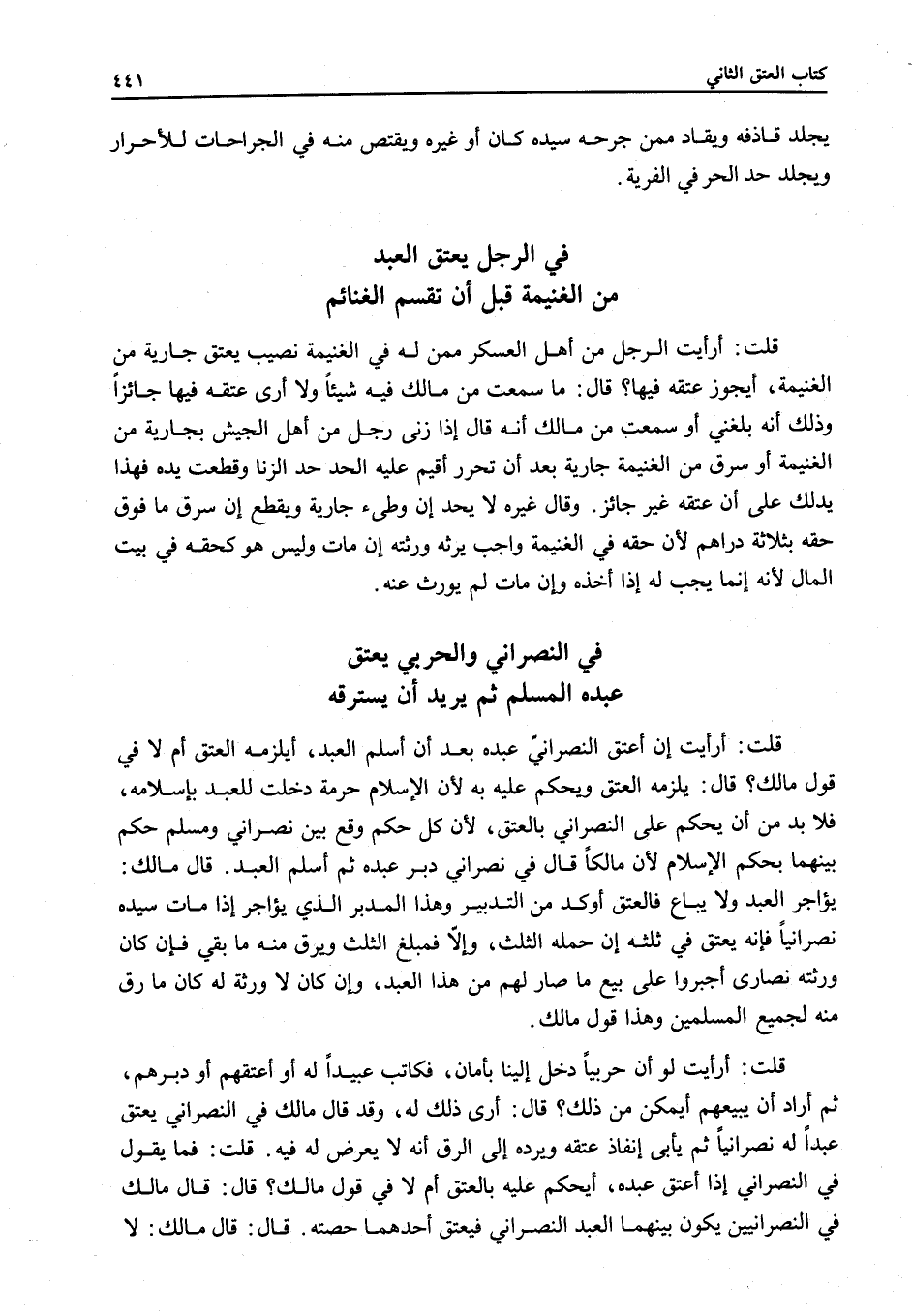 قَالَ: قَالَ مَالِكٌ فِي النَّصْرَانِيِّينَ يَكُونُ بَيْنَهُمَا الْعَبْدُ النَّصْرَانِيُّ فَيُعْتِقُ أَحَدُهُمَا حِصَّتَهُ.