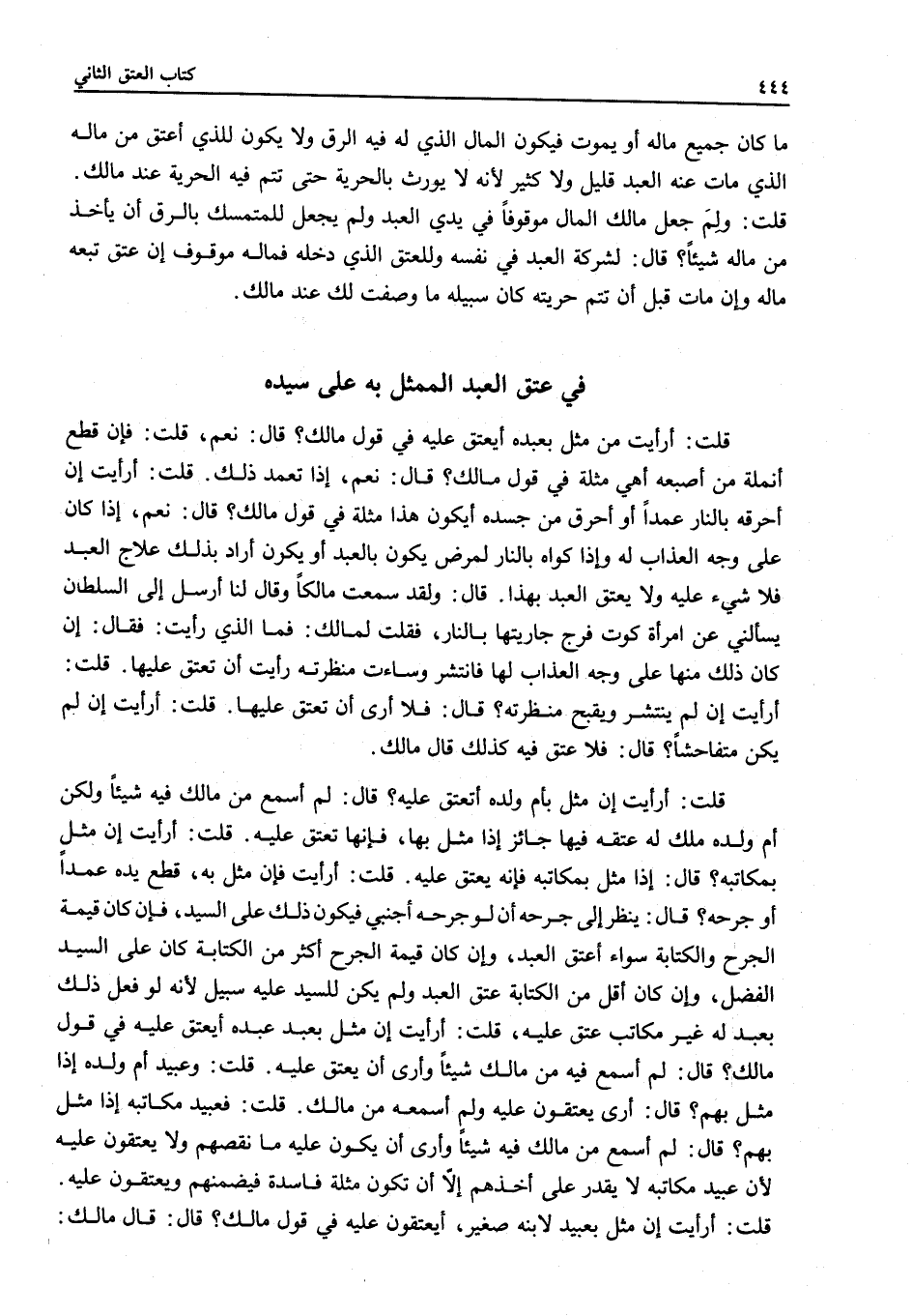 قَالَ: وَلَقَدْ سَمِعْتُ مَالِكًا وَقَالَ لَنَا: أَرْسَلَ إلَيَّ السُّلْطَانُ يَسْأَلُنِي عَنْ امْرَأَةٍ كَوَتْ فَرْجَ جَارِيَتِهَا بِالنَّارِ، فَقُلْتُ لِمَالِكٍ: فَمَا الَّذِي رَأَيْتَ: فَقَالَ: إنْ كَانَ ذَلِكَ مِنْهَا عَلَى وَجْهِ الْعَذَابِ لَهَا فَانْتَشَرَ وَسَاءَتْ مَنْظَرَتُهُ رَأَيْتُ أَنْ تُعْتَقَ عَلَيْهَا.