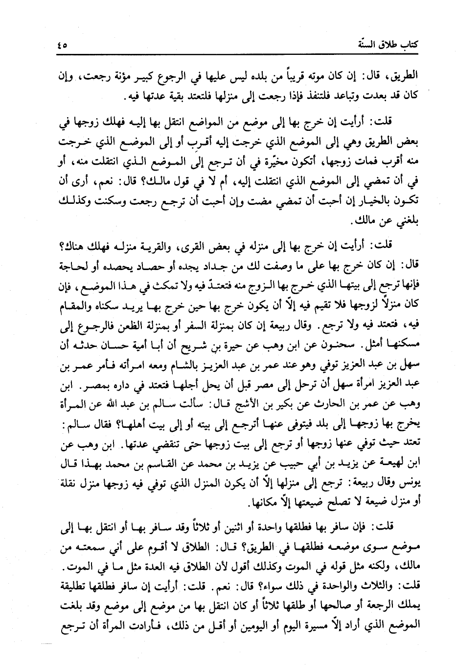 قَالَ: إنْ كَانَ خَرَجَ بِهَا عَلَى مَا وَصَفْت لَكَ مِنْ جِدَادٍ يَجُدّهُ أَوْ حَصَادٍ يَحْصُدُهُ أَوْ لِحَاجَةٍ فَإِنَّهَا تَرْجِعُ إلَى بَيْتِهَا الَّذِي خَرَجَ بِهَا الزَّوْجُ مِنْهُ فَتَعْتَدُّ فِيهِ وَلَا تَمْكُثُ فِي هَذَا الْمَوْضِعِ، فَإِنْ كَانَ مَنْزِلًا لِزَوْجِهَا فَلَا تُقِيمُ فِيهِ إلَّا أَنْ يَكُونَ خَرَجَ بِهَا حِينَ خَرَجَ بِهَا يُرِيدُ سُكْنَاهُ وَالْمَقَامَ فِيهِ، فَتَعْتَدُّ فِيهِ وَلَا تَرْجِعُ وَقَالَ رَبِيعَةُ إنْ كَانَ بِمَنْزِلَةِ السَّفَرِ أَوْ بِمَنْزِلَةِ الظَّعْنِ فَالرُّجُوعُ إلَى مَسْكَنِهَا أَمْثَلُ سَحْنُونٌ عَنْ ابْنِ وَهْبٍ عَنْ حِيرَةَ بْنِ شُرَيْحٍ أَنَّ أَبَا أُمَيَّةَ حَسَّانَ حَدَّثَهُ أَنَّ سَهْلَ بْنَ عَبْدِ الْعَزِيزِ تُوُفِّيَ وَهُوَ عِنْدَ عُمَرَ بْنِ عَبْدِ الْعَزِيزِ بِالشَّامِ وَمَعَهُ امْرَأَتُهُ فَأَمَرَ عُمَرُ بْنُ عَبْدِ الْعَزِيزِ امْرَأَةَ سَهْلٍ أَنْ تَرْحَلَ إلَى مِصْرَ قَبْلَ أَنْ يَحِلَّ أَجَلُهَا فَتَعْتَدُّ فِي دَارِهِ بِمِصْرَ ابْنُ وَهْبٍ عَنْ عُمَرَ بْنِ الْحَارِثِ عَنْ بُكَيْرِ بْنِ الْأَشَجِّ قَالَ: سَأَلْتُ سَالِمَ بْنَ عَبْدِ اللَّهِ عَنْ الْمَرْأَةِ يَخْرُجُ بِهَا زَوْجُهَا إلَى بَلَدٍ فَيُتَوَفَّى عَنْهَا أَتَرْجِعُ إلَى بَيْتِهِ أَوْ إلَى بَيْتِ أَهْلِهَا؟ فَقَالَ سَالِمٌ: تَعْتَدُّ حَيْثُ تُوُفِّيَ عَنْهَا زَوْجُهَا أَوْ تَرْجِعُ إلَى بَيْتِ زَوْجِهَا حَتَّى تَنْقَضِيَ عِدَّتُهَا ابْنُ وَهْبٍ عَنْ ابْنِ لَهِيعَةَ عَنْ يَزِيدَ بْنِ أَبِي حَبِيبٍ عَنْ يَزِيدَ بْنِ مُحَمَّدٍ عَنْ الْقَاسِمِ بْنِ مُحَمَّدٍ بِهَذَا قَالَ يُونُسُ وَقَالَ رَبِيعَةُ: تَرْجِعُ إلَى مَنْزِلِهَا إلَّا أَنْ يَكُونَ الْمَنْزِلُ الَّذِي تُوُفِّيَ فِيهِ زَوْجُهَا مَنْزِلَ نَقْلَةٍ أَوْ مَنْزِلَ ضَيْعَةٍ لَا تَصْلُحُ ضَيْعَتُهَا إلَّا مَكَانَهَا