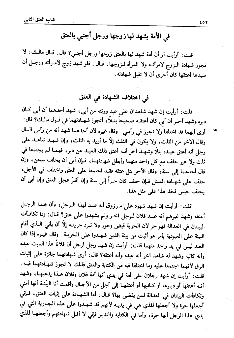 فِي الْأَمَةِ يَشْهَدُ لَهَا زَوْجُهَا وَرَجُلٌ أَجْنَبِيٌّ بِالْعِتْقِ قُلْتُ: أَرَأَيْتَ لَوْ أَنَّ أَمَةً شَهِدَ لَهَا بِالْعِتْقِ زَوْجُهَا وَرَجُلٌ أَجْنَبِيٌّ؟