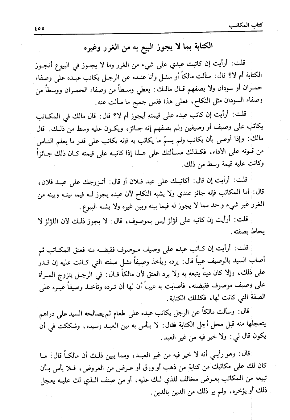 ِ قُلْتُ: أَرَأَيْتَ إنْ كَاتَبْتُ عَبْدِي عَلَى شَيْءٍ مِنْ الْغَرَرِ وَمَا لَا يَجُوزُ فِي الْبُيُوعِ أَتَجُوزُ الْكِتَابَةُ أَمْ لَا؟ قَالَ: سَأَلْتُ مَالِكًا أَوْ سُئِلَ وَأَنَا عِنْدَهُ عَنْ الرَّجُلِ يُكَاتِبُ عَبْدَهُ عَلَى وُصَفَاءَ حُمْرَانٍ أَوْ سُودَانٍ وَلَا يَصِفَهُمْ قَالَ مَالِكٌ: يُعْطِي وَسَطًا مِنْ وُصَفَاءِ الْحُمْرَانِ وَوَسَطًا مِنْ وُصَفَاءِ السُّودَانِ مِثْلَ النِّكَاحِ، فَعَلَى هَذَا فَقِسْ جَمِيعَ مَا سَأَلْتَ عَنْهُ.