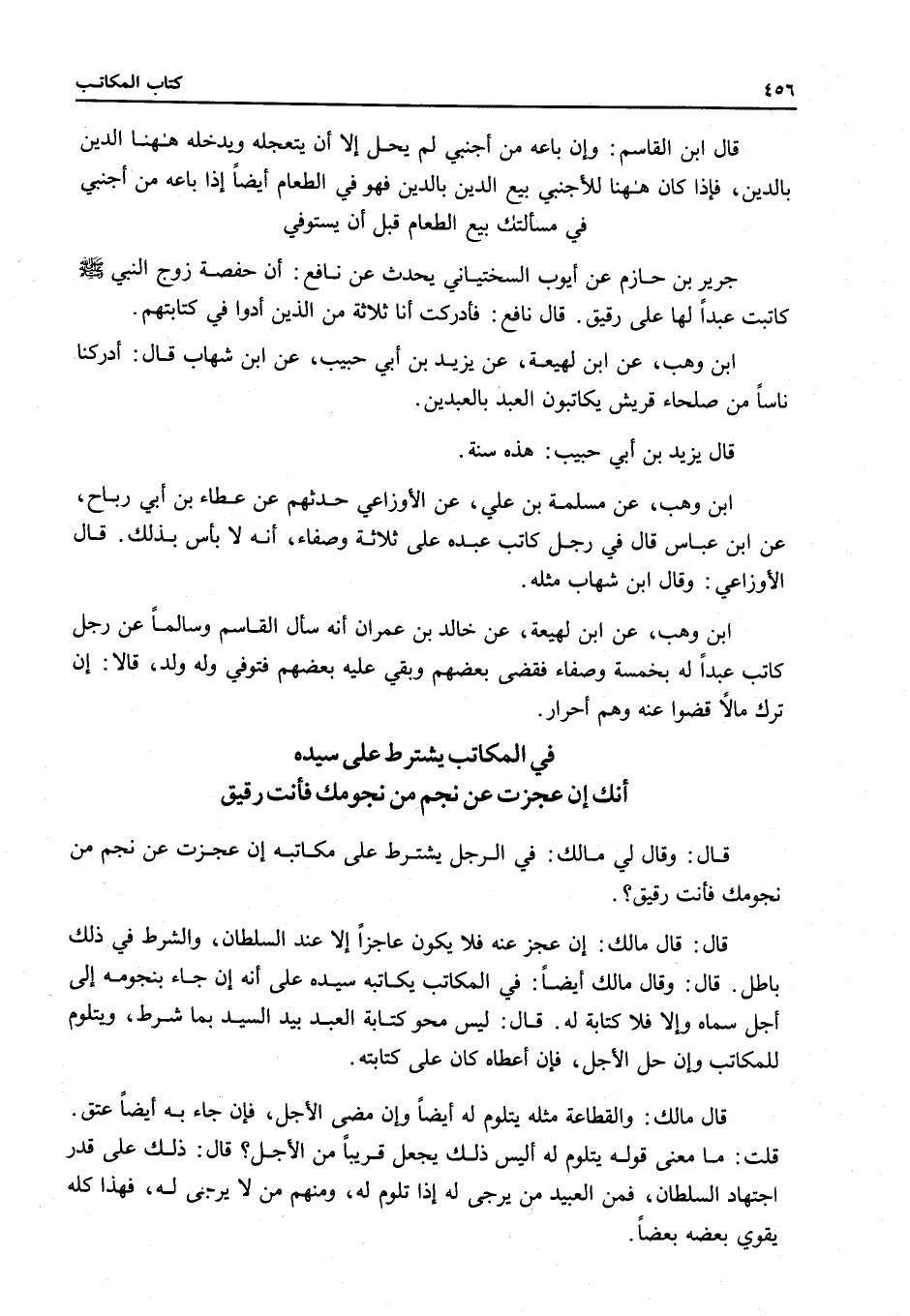 قَالَ نَافِعٌ: فَأَدْرَكْتُ أَنَا ثَلَاثَةً مِنْ الَّذِينَ أَدَّوْا فِي كِتَابَتِهِمْ. ابْنُ وَهْبٍ، عَنْ ابْنِ لَهِيعَةَ، عَنْ يَزِيدَ بْنِ أَبِي حَبِيبٍ، عَنْ ابْنِ شِهَابٍ قَالَ: أَدْرَكَنَا نَاسًا مِنْ صُلَحَاءِ قُرَيْشٍ يُكَاتِبُونَ الْعَبْدَ بِالْعَبْدَيْنِ.