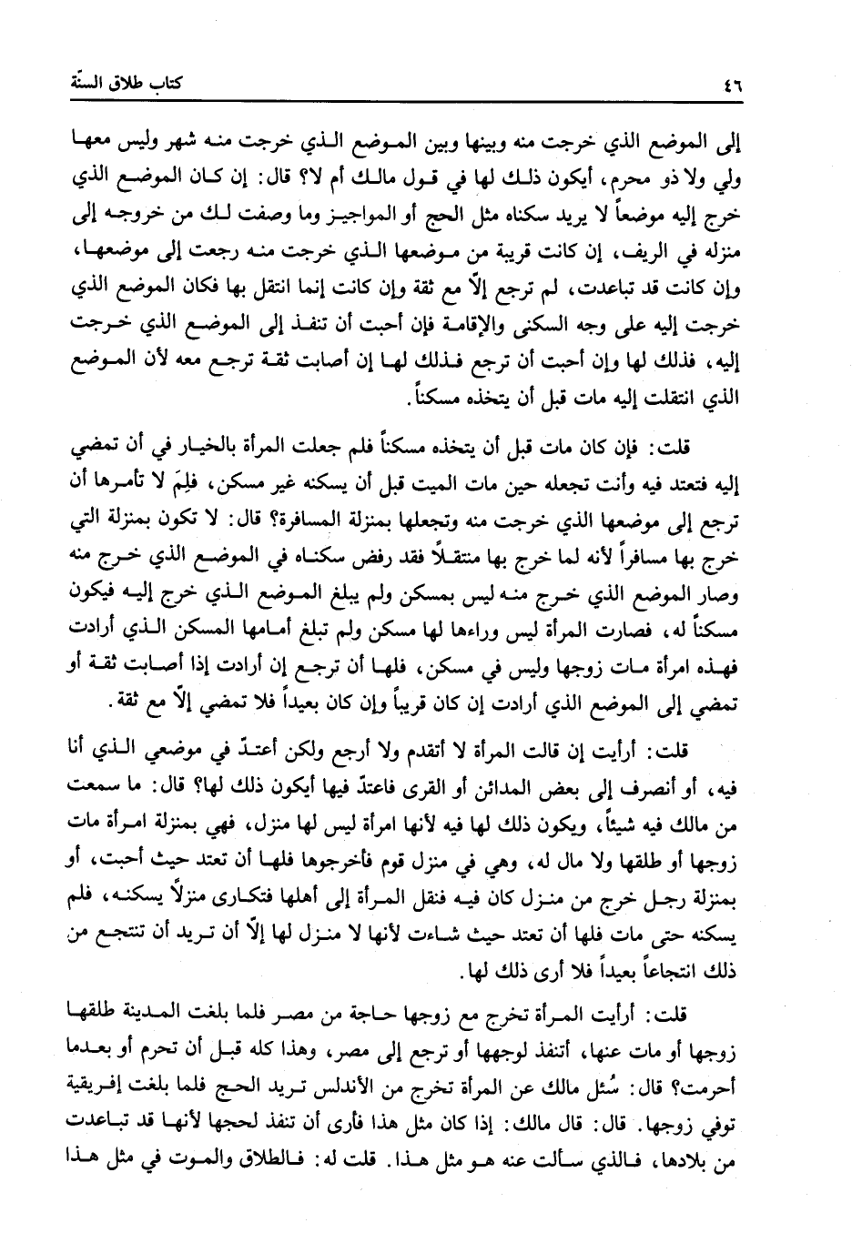 قَالَ: سُئِلَ مَالِكٌ عَنْ الْمَرْأَةِ تَخْرُجُ مِنْ الْأَنْدَلُسِ تُرِيدُ الْحَجَّ فَلَمَّا بَلَغَتْ إفْرِيقِيَّةَ تُوُفِّيَ زَوْجُهَا.
