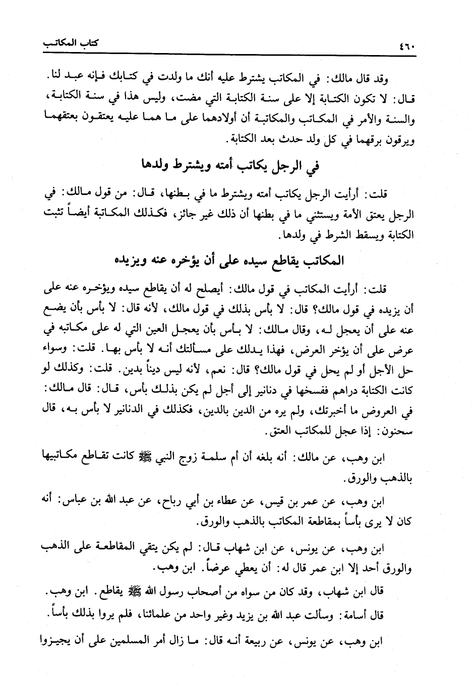 ابْنُ وَهْبٍ، عَنْ مَالِكٍ: أَنَّهُ بَلَغَهُ أَنَّ أُمَّ سَلَمَةَ زَوْجَ النَّبِيِّ - صَلَّى اللَّهُ عَلَيْهِ وَسَلَّمَ - كَانَتْ تُقَاطِعُ مُكَاتَبِيهَا بِالذَّهَبِ وَالْوَرِقِ.