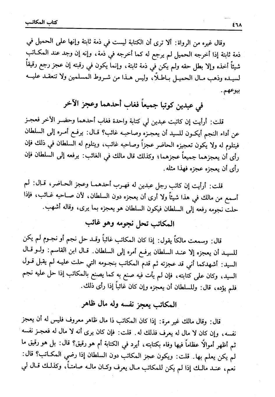 ٌ قَالَ: وَسَمِعْتُ مَالِكًا يَقُولُ: إذَا كَانَ الْمُكَاتَبُ غَائِبًا وَقَدْ حَلَّ نَجْمٌ أَوْ نُجُومٌ لَمْ يَكُنْ لِلسَّيِّدِ أَنْ يُعْجِزَهُ إلَّا عِنْدَ السُّلْطَانِ يَرْفَعُ أَمْرَهُ إلَى السُّلْطَانِ.