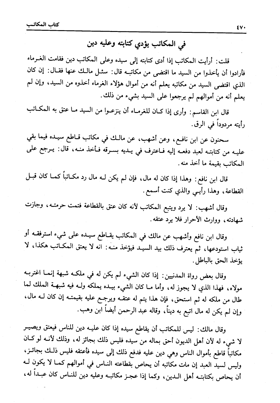 فِي الْمُكَاتَبِ يُؤَدِّي كِتَابَتَهُ وَعَلَيْهِ دَيْنٌ قُلْتُ: أَرَأَيْتَ الْمُكَاتَبَ إذَا أَدَّى كِتَابَتَهُ إلَى سَيِّدِهِ وَعَلَى الْمُكَاتَبِ دَيْنٌ فَقَامَتْ الْغُرَمَاءُ فَأَرَادُوا أَنْ يَأْخُذُوا مِنْ السَّيِّدِ مَا اقْتَضَى مِنْ مُكَاتَبِهِ قَالَ: سُئِلَ مَالِكٌ عَنْهَا فَقَالَ: إنْ كَانَ الَّذِي اقْتَضَى السَّيِّدُ مِنْ مُكَاتَبِهِ يَعْلَمُ أَنَّهُ مِنْ أَمْوَالِ هَؤُلَاءِ الْغُرَمَاءِ أَخَذُوهُ مِنْ السَّيِّدِ، وَإِنْ لَمْ يَعْلَمْ أَنَّهُ مِنْ أَمْوَالِهِمْ لَمْ يَرْجِعُوا عَلَى السَّيِّدِ بِشَيْءٍ مِنْ ذَلِكَ.