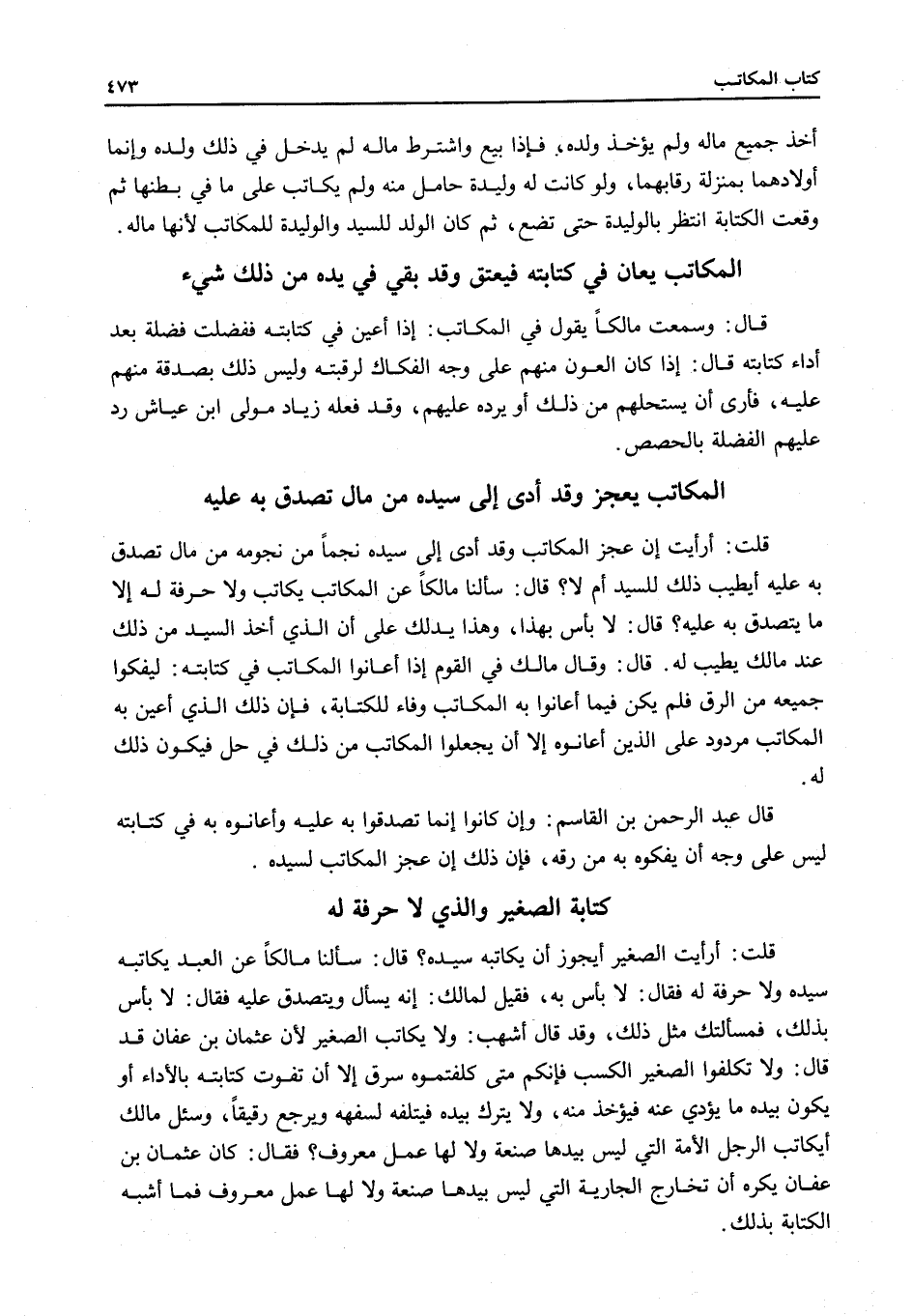 قَالَ: سَأَلْنَا مَالِكًا عَنْ الْعَبْدِ يُكَاتِبُهُ سَيِّدُهُ وَلَا حِرْفَةَ لَهُ فَقَالَ: لَا بَأْسَ بِهِ، فَقِيلَ لِمَالِكٍ: إنَّهُ يَسْأَلُ وَيُتَصَدَّقُ عَلَيْهِ فَقَالَ: لَا بَأْسَ بِذَلِكَ، فَمَسْأَلَتُكَ مِثْلُ ذَلِكَ، وَقَدْ قَالَ أَشْهَبُ: وَلَا يُكَاتَبُ الصَّغِيرُ؛ لِأَنَّ عُثْمَانَ بْنَ عَفَّانَ قَدْ قَالَ: وَلَا تُكَلِّفُوا الصَّغِيرَ الْكَسْبَ فَإِنَّكُمْ مَتَى كَلَّفْتُمُوهُ سَرَقَ إلَّا أَنْ تَفُوتَ كِتَابَتُهُ بِالْأَدَاءِ أَوْ يَكُونُ بِيَدِهِ مَا يُؤَدِّي عَنْهُ فَيُؤْخَذُ مِنْهُ وَلَا يُتْرَكُ بِيَدِهِ فَيُتْلِفُهُ لِسَفَهِهِ وَيَرْجِعُ رَقِيقًا وَسُئِلَ مَالِكٌ أَيُكَاتِبُ الرَّجُلُ الْأَمَةَ الَّتِي لَيْسَ بِيَدِهَا صَنْعَةٌ وَلَا لَهَا عَمَلٌ مَعْرُوفٌ؟ فَقَالَ: كَانَ عُثْمَانُ بْنُ عَفَّانَ يَكْرَهُ أَنْ تُخَارَجَ الْجَارِيَةُ الَّتِي لَيْسَ بِيَدِهَا صَنْعَةٌ وَلَا لَهَا عَمَلٌ مَعْرُوفٌ فَمَا أَشْبَهَ الْكِتَابَةَ بِذَلِكَ.