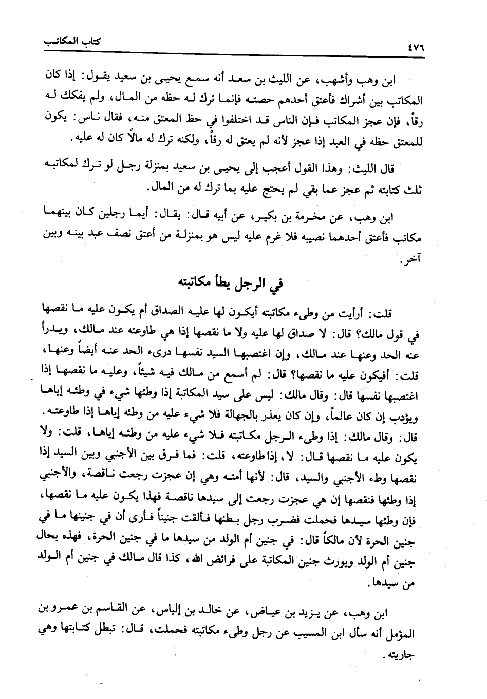 ابْنُ وَهْبٍ، عَنْ يَزِيدَ بْنِ عِيَاضٍ، عَنْ خَالِدِ بْنِ إلْيَاسَ، عَنْ الْقَاسِمِ بْنِ عَمْرِو بْنِ الْمُؤَمِّلِ أَنَّهُ سَأَلَ ابْنَ الْمُسَيِّبِ عَنْ رَجُلٍ وَطِئَ مُكَاتَبَتَهُ فَحَمَلَتْ، قَالَ: تَبْطُلُ كِتَابَتُهَا وَهِيَ جَارِيَتُهُ.