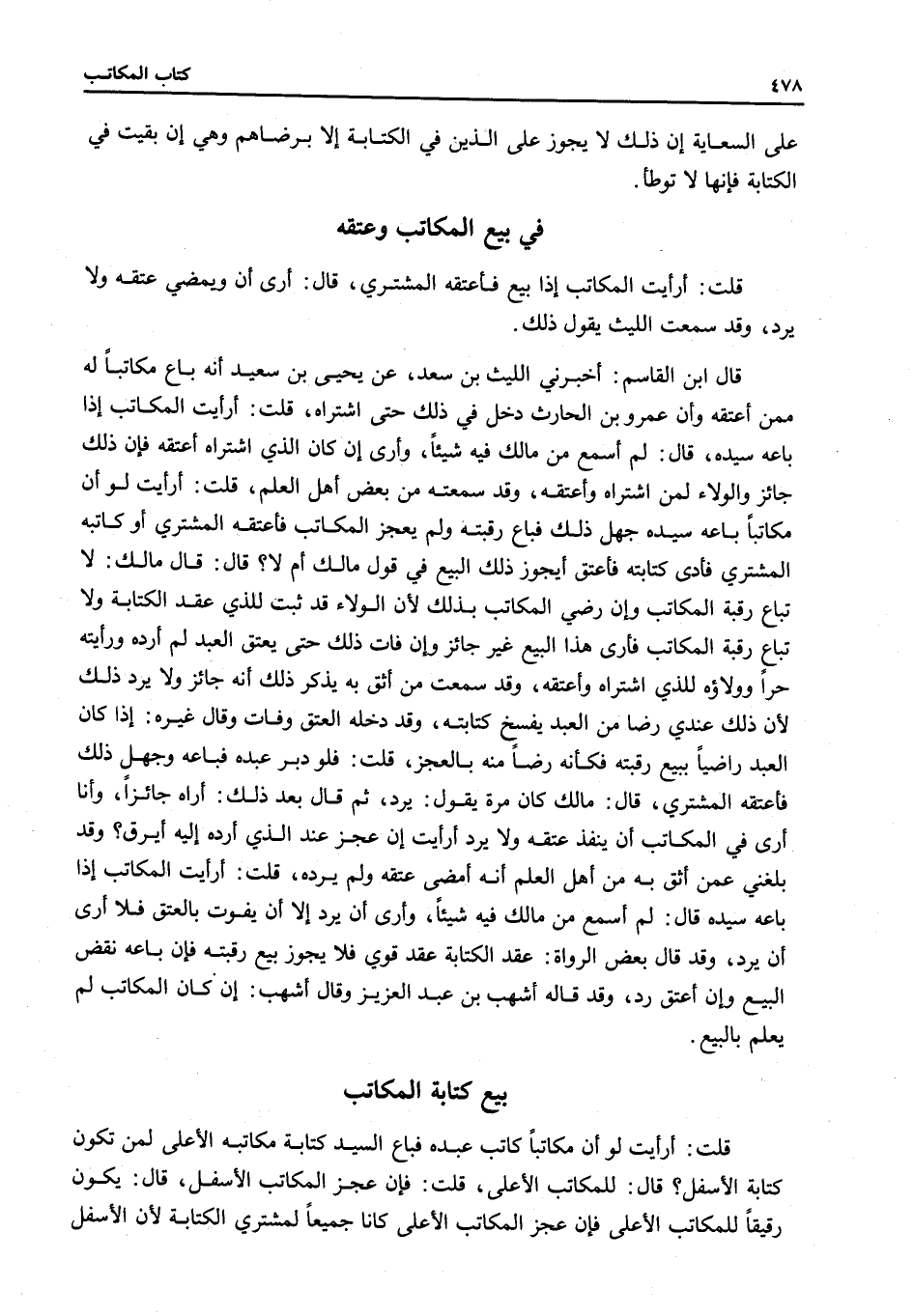 فِي بَيْعِ الْمُكَاتَبِ وَعِتْقِهِ قُلْتُ: أَرَأَيْتَ الْمُكَاتَبَ إذَا بِيعَ فَأَعْتَقَهُ الْمُشْتَرِي، قَالَ: أَرَى أَنْ يَمْضِيَ عِتْقُهُ وَلَا يُرَدُّ، وَقَدْ سَمِعْتُ اللَّيْثَ يَقُولُ ذَلِكَ.