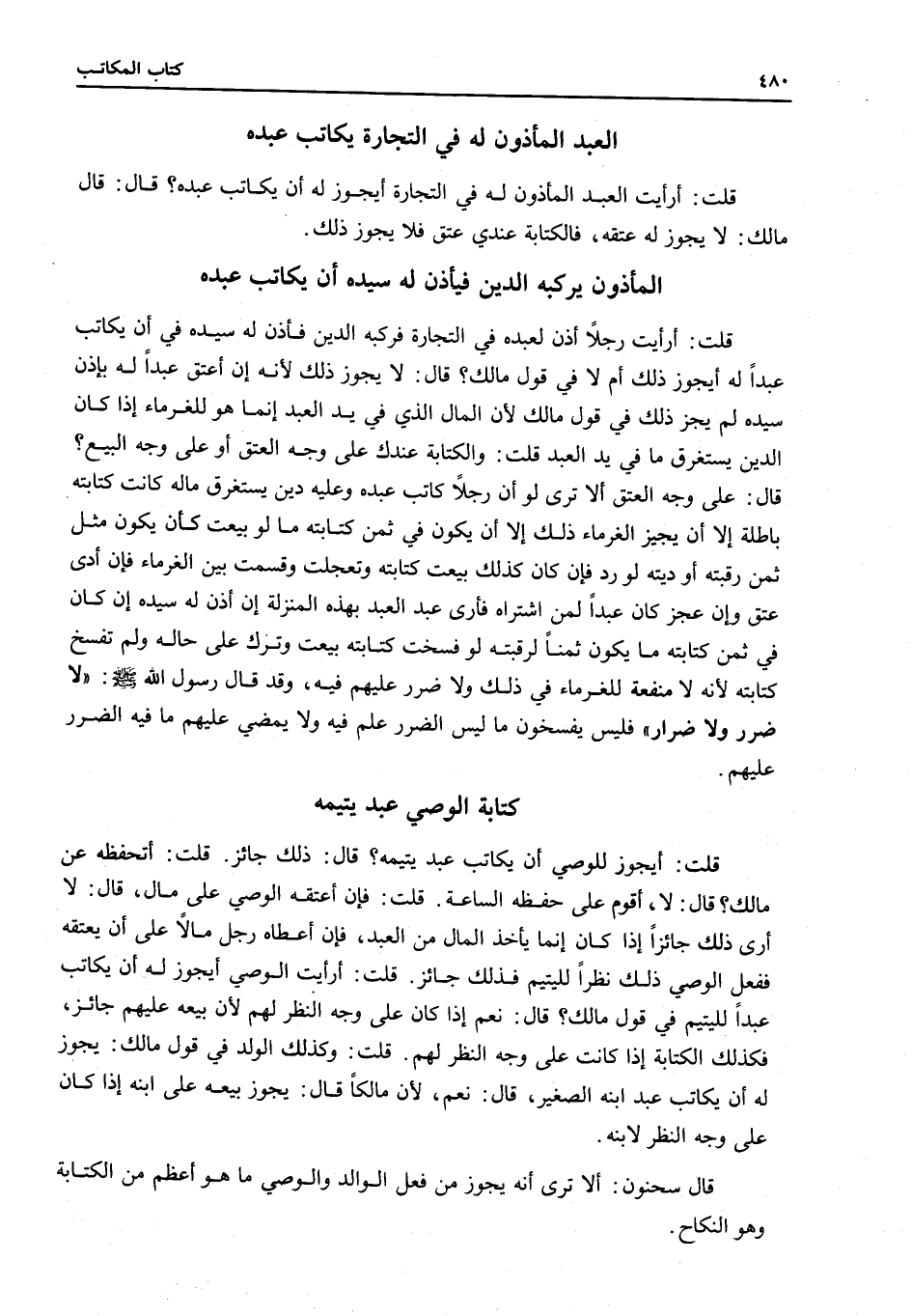 ُ قُلْتُ: أَرَأَيْتَ رَجُلًا أَذِنَ لِعَبْدِهِ فِي التِّجَارَةِ فَرَكِبَهُ الدَّيْنُ فَأَذِنَ لَهُ سَيِّدُهُ فِي أَنْ يُكَاتِبَ عَبْدًا لَهُ أَيَجُوزُ ذَلِكَ أَمْ لَا فِي قَوْلِ مَالِكٍ؟