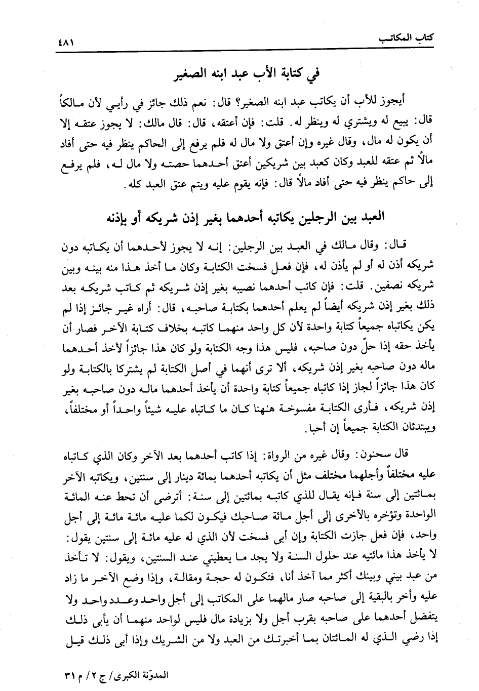فِي كِتَابَةِ الْأَبِ عَبْدَ ابْنِهِ الصَّغِيرِ قُلْتُ: أَيَجُوزُ لِلْأَبِ أَنْ يُكَاتِبَ عَبْدَ ابْنِهِ الصَّغِيرِ؟