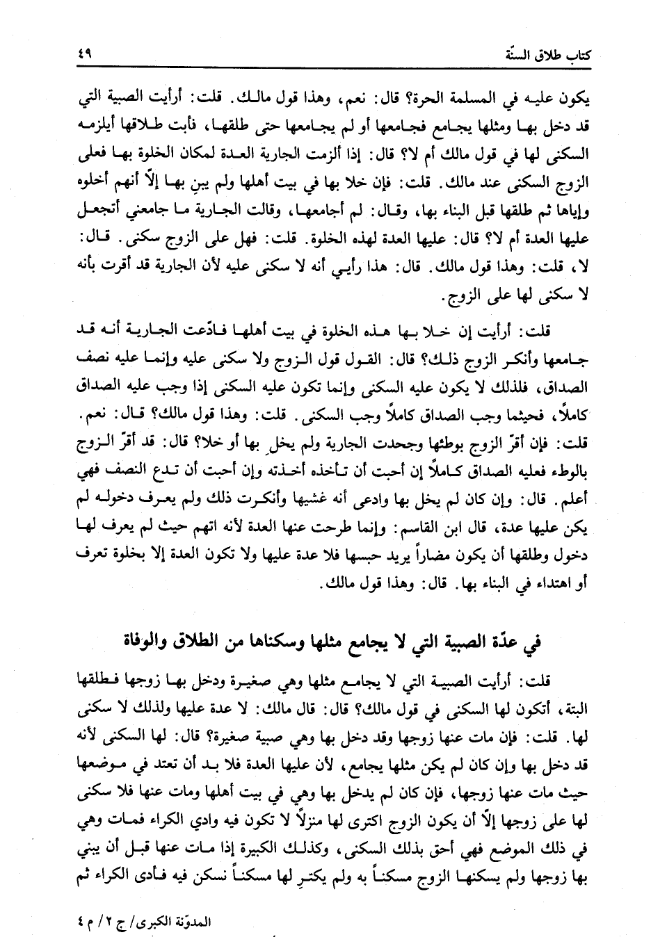فِي عِدَّةِ الصَّبِيَّةِ الَّتِي لَا يُجَامَعُ مِثْلُهَا وَسُكْنَاهَا مِنْ الطَّلَاقِ وَالْوَفَاةِ قُلْتُ: أَرَأَيْتَ الصَّبِيَّةَ الَّتِي لَا يُجَامَعُ مِثْلُهَا وَهِيَ صَغِيرَةٌ وَدَخَلَ بِهَا زَوْجُهَا فَطَلَّقَهَا أَلْبَتَّةَ، أَتَكُونُ لَهَا السُّكْنَى فِي قَوْلِ مَالِكٍ؟