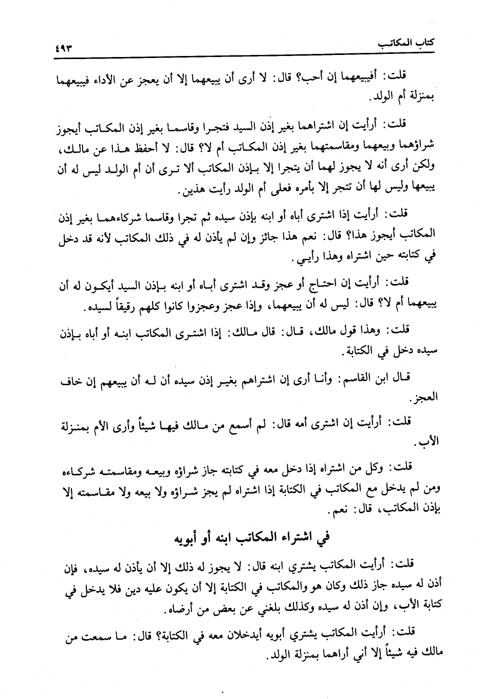 فِي اشْتِرَاءِ الْمُكَاتَبِ ابْنَهُ أَوْ أَبَوَيْهِ قُلْتُ: أَرَأَيْتَ الْمُكَاتَبَ يَشْتَرِي ابْنَهُ قَالَ: لَا يَجُوزُ لَهُ ذَلِكَ إلَّا أَنْ يَأْذَنَ لَهُ سَيِّدُهُ، فَإِنْ أَذِنَ لَهُ سَيِّدُهُ جَازَ ذَلِكَ وَكَانَ هُوَ وَالْمُكَاتَبُ فِي الْكِتَابَةِ إلَّا أَنْ يَكُونَ عَلَيْهِ دَيْنٌ فَلَا يَدْخُلُ فِي كِتَابَةِ الْأَبِ، وَإِنْ أَذِنَ لَهُ سَيِّدُهُ وَكَذَلِكَ بَلَغَنِي عَنْ بَعْضِ مَنْ أَرْضَاهُ.