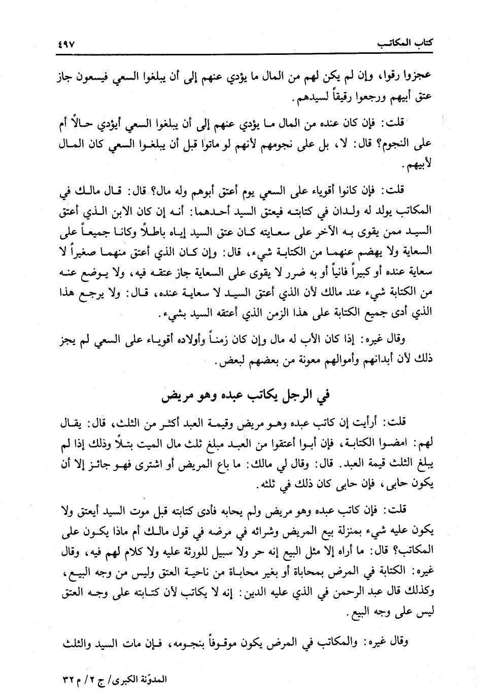 قَالَ: مَا أَرَاهُ إلَّا مِثْلَ الْبَيْعِ إنَّهُ حُرٌّ وَلَا سَبِيلَ لِلْوَرَثَةِ عَلَيْهِ وَلَا كَلَامَ لَهُمْ فِيهِ، وَقَالَ غَيْرُهُ: الْكِتَابَةُ فِي الْمَرَضِ بِمُحَابَاةٍ أَوْ بِغَيْرِ مُحَابَاةٍ مِنْ نَاحِيَةِ الْعِتْقِ وَلَيْسَ مِنْ وَجْهِ الْبَيْعِ، وَكَذَلِكَ قَالَ عَبْدُ الرَّحْمَنِ فِي الَّذِي عَلَيْهِ الدَّيْنُ: إنَّهُ لَا يُكَاتَبُ؛ لِأَنَّ كِتَابَتَهُ عَلَى وَجْهِ الْعِتْقِ لَيْسَ عَلَى وَجْهِ الْبَيْعِ