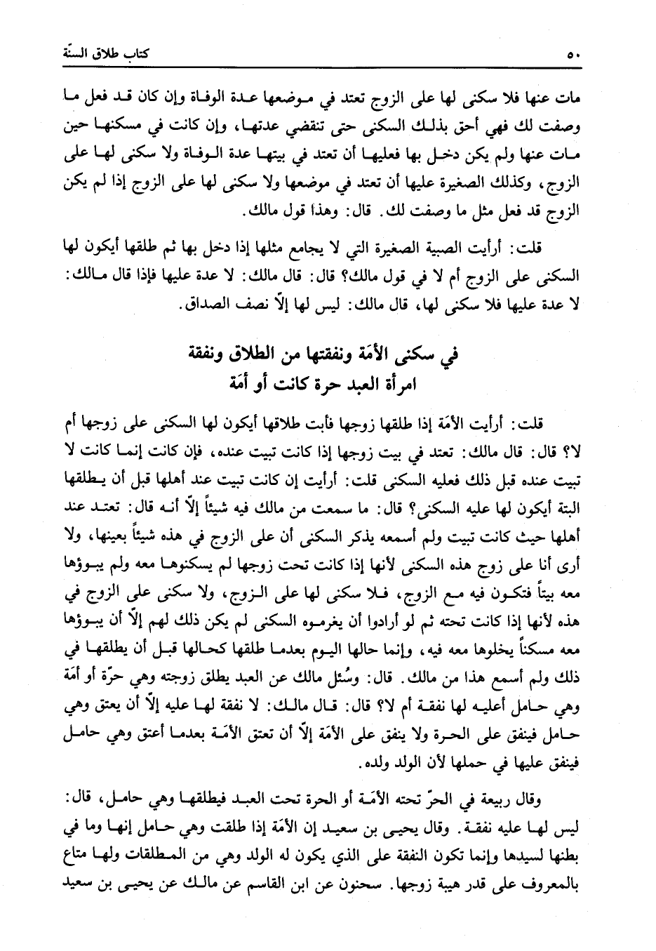 قَالَ وَسُئِلَ مَالِكٌ عَنْ الْعَبْدِ يُطَلِّقُ زَوْجَتَهُ وَهِيَ حُرَّةٌ أَوْ أَمَةٌ وَهِيَ حَامِلٌ أَعَلَيْهِ لَهَا نَفَقَةٌ أَمْ لَا؟