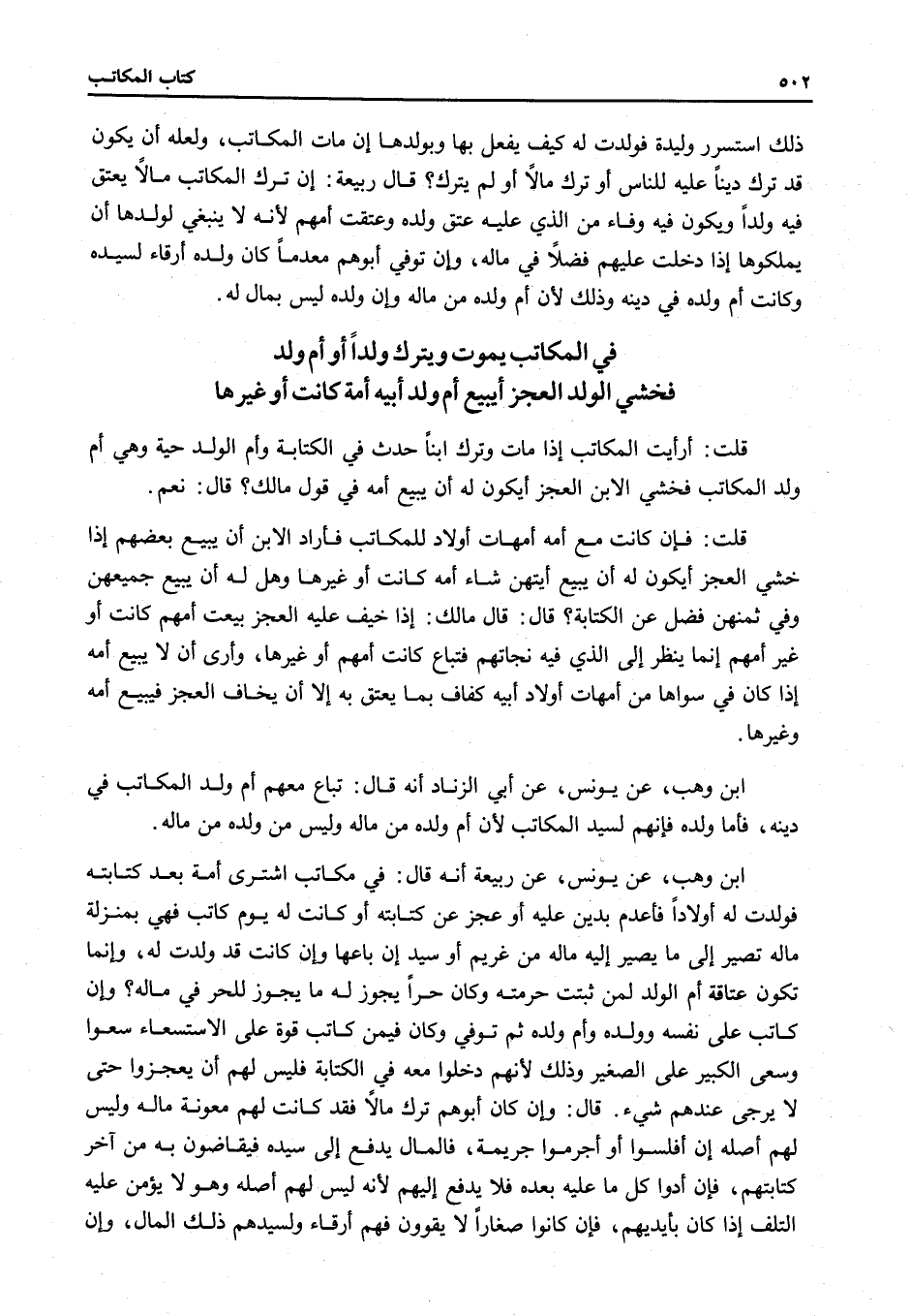 ابْنُ وَهْبٍ، عَنْ يُونُسَ، عَنْ أَبِي الزِّنَادِ أَنَّهُ قَالَ: تُبَاعُ مَعَهُمْ أُمُّ وَلَدِ الْمُكَاتَبِ فِي دَيْنِهِ، فَأَمَّا وَلَدُهُ فَإِنَّهُمْ لِسَيِّدِ الْمُكَاتَبِ؛ لِأَنَّ أُمَّ وَلَدِهِ مِنْ مَالِهِ وَلَيْسَ مَنْ وَلَدَهُ مِنْ مَالِهِ.