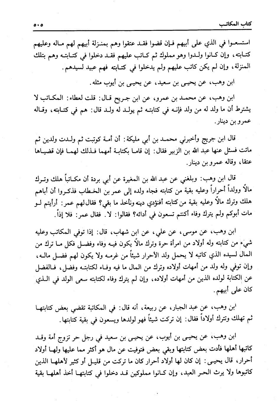 ابْنُ وَهْبٍ، عَنْ مُوسَى، عَنْ عَلِيٍّ، عَنْ ابْنِ شِهَابٍ، قَالَ: إذَا تُوُفِّيَ الْمُكَاتَبُ وَعَلَيْهِ شَيْءٌ مِنْ كِتَابَتِهِ وَلَهُ أَوْلَادٌ مِنْ امْرَأَةٍ حُرَّةٍ وَتَرَكَ مَالًا يَكُونُ فِيهِ وَفَاءٌ وَفَضْلٌ فَكُلُّ مَا تَرَكَ مِنْ الْمَالِ لِسَيِّدِهِ الَّذِي كَاتَبَهُ لَا يَحْمِلُ وَلَدُ الْأَحْرَارِ شَيْئًا مِنْ غُرْمِهِ وَلَا يَكُونُ لَهُمْ فَضْلُ مَالِهِ، وَإِنْ تُوُفِّيَ وَلَهُ وَلَدٌ مِنْ أُمَّهَاتِ أَوْلَادِهِ وَتَرَكَ مِنْ الْمَالِ مَا فِيهِ وَفَاءٌ لِكِتَابَتِهِ وَفَضْلٌ، فَالْفَضْلُ عَنْ الْكِتَابَةِ لِوَلَدِهِ الَّذِينَ مِنْ أُمَّهَاتِ أَوْلَادِهِ، وَإِنْ لَمْ يَتْرُكْ وَفَاءً لِكِتَابَتِهِ سَعَى الْوَلَدُ فِي الَّذِي كَانَ عَلَى أَبِيهِمْ. ابْنُ وَهْبٍ، عَنْ عَبْدِ الْجَبَّارِ، عَنْ رَبِيعَةَ، أَنَّهُ قَالَ: فِي الْمُكَاتَبَةِ تَقْضِي بَعْضَ كِتَابَتِهَا ثُمَّ تَهْلَكُ وَتَتْرُكُ أَوْلَادًا فَقَالَ: إنْ تَرَكَتْ شَيْئًا فَهُوَ لِوَلَدِهَا وَيَسْعَوْنَ فِي بَقِيَّةِ كِتَابَتِهَا.
