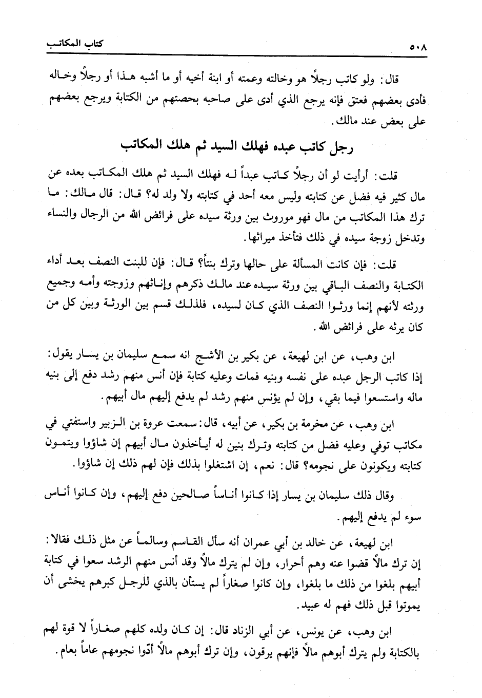 قَالَ: قَالَ مَالِكٌ: مَا تَرَكَ هَذَا الْمُكَاتَبُ مِنْ مَالٍ فَهُوَ مَوْرُوثٌ بَيْنَ وَرَثَةِ سَيِّدِهِ عَلَى فَرَائِضِ اللَّهِ مِنْ الرِّجَالِ وَالنِّسَاءِ وَتَدْخُلُ زَوْجَةُ سَيِّدِهِ فِي ذَلِكَ فَتَأْخُذُ مِيرَاثَهَا.
