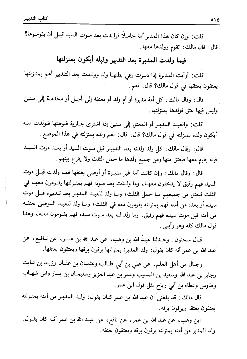 قَالَ سَحْنُونٌ: وَحَدَّثَنَا عَبْدُ اللَّهِ بْنُ وَهْبٍ، عَنْ عَبْدِ اللَّهِ بْنِ عُمَرَ، عَنْ نَافِعٍ، عَنْ عَبْدِ اللَّهِ بْنِ عُمَرَ أَنَّهُ كَانَ يَقُولُ: وَلَدُ الْمُدَبَّرَةِ بِمَنْزِلَتِهَا يُرَقُّونَ بِرِقِّهَا وَيُعْتَقُونَ بِعِتْقِهَا. رِجَالٌ مِنْ أَهْلِ الْعِلْمِ، عَنْ عَلِيِّ بْنِ أَبِي طَالِبٍ وَعُثْمَانَ بْنِ عَفَّانَ وَزَيْدِ بْنِ ثَابِتٍ وَجَابِرِ بْنِ عَبْدِ اللَّهِ وَسَعِيدِ بْنِ الْمُسَيِّبِ وَعُمَرَ بْنِ عَبْدِ الْعَزِيزِ وَسُلَيْمَانَ بْنِ يَسَارٍ وَابْنِ شِهَابٍ وَطَاوُسٍ وَعَطَاءِ بْنِ أَبِي رَبَاحٍ مِثْلُ قَوْلِ ابْنِ عُمَرَ.