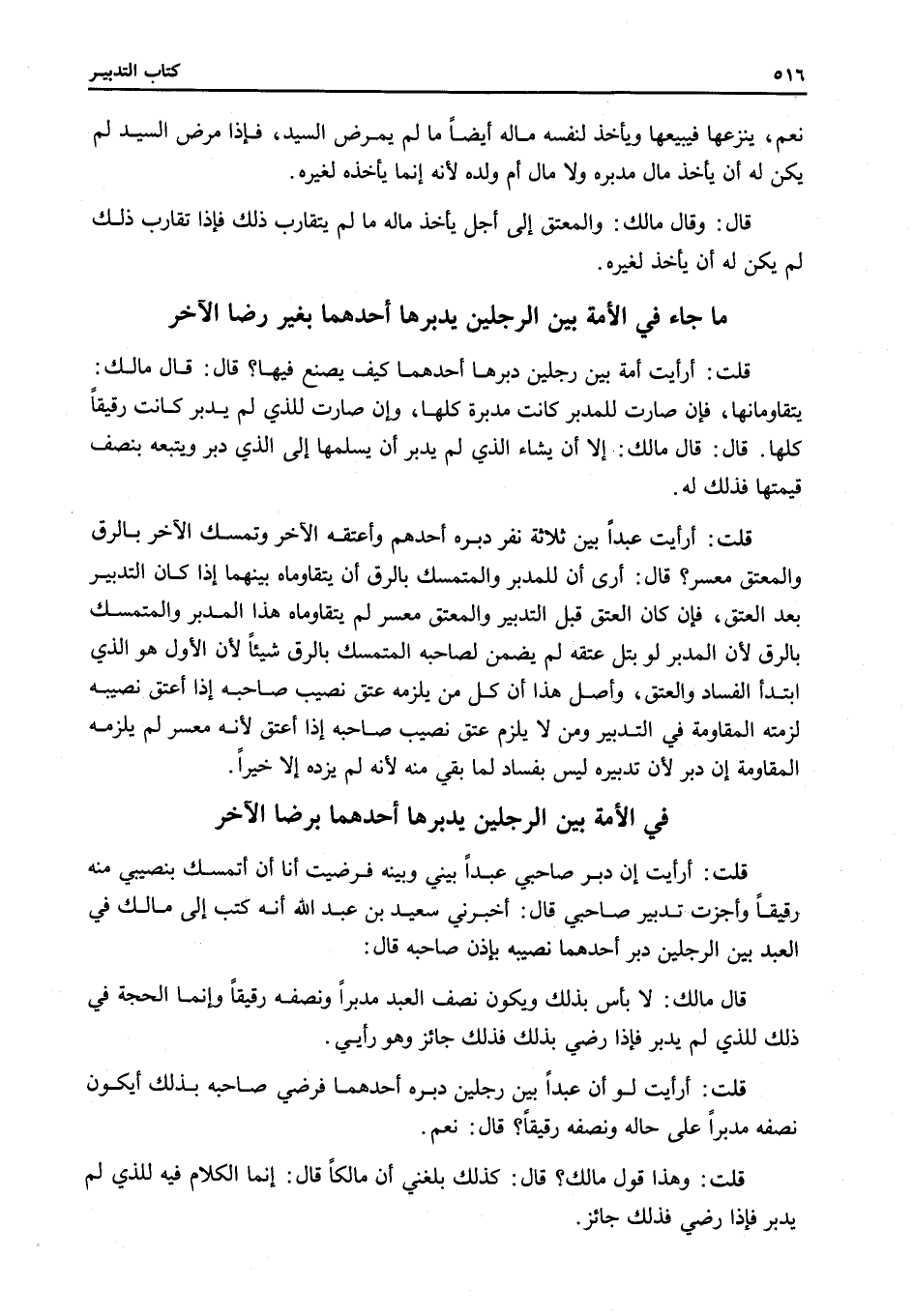 فِي الْأَمَةِ بَيْنَ الرَّجُلَيْنِ يُدَبِّرُهَا أَحَدُهُمَا بِرِضَا الْآخَرِ قُلْتُ: أَرَأَيْتَ إنْ دَبَّرَ صَاحِبِي عَبْدًا بَيْنِي وَبَيْنَهُ فَرَضِيتُ أَنَا أَنْ أَتَمَسَّكَ بِنَصِيبِي مِنْهُ رَقِيقًا وَأَجَزْت تَدْبِيرَ صَاحِبِي قَالَ: أَخْبَرَنِي سَعِيدُ بْنُ عَبْدِ اللَّهِ أَنَّهُ كَتَبَ إلَى مَالِكٍ فِي الْعَبْدِ بَيْنَ الرَّجُلَيْنِ دَبَّرَ أَحَدُهُمَا نَصِيبَهُ بِإِذْنِ صَاحِبِهِ قَالَ: قَالَ مَالِكٌ: لَا بَأْسَ بِذَلِكَ وَيَكُونُ نِصْفُ الْعَبْدِ مُدَبَّرًا وَنِصْفُهُ رَقِيقًا وَإِنَّمَا الْحُجَّةُ فِي ذَلِكَ لِلَّذِي لَمْ يُدَبِّرْ فَإِذَا رَضِيَ بِذَلِكَ فَذَلِكَ جَائِزٌ وَهُوَ رَأْيِي.