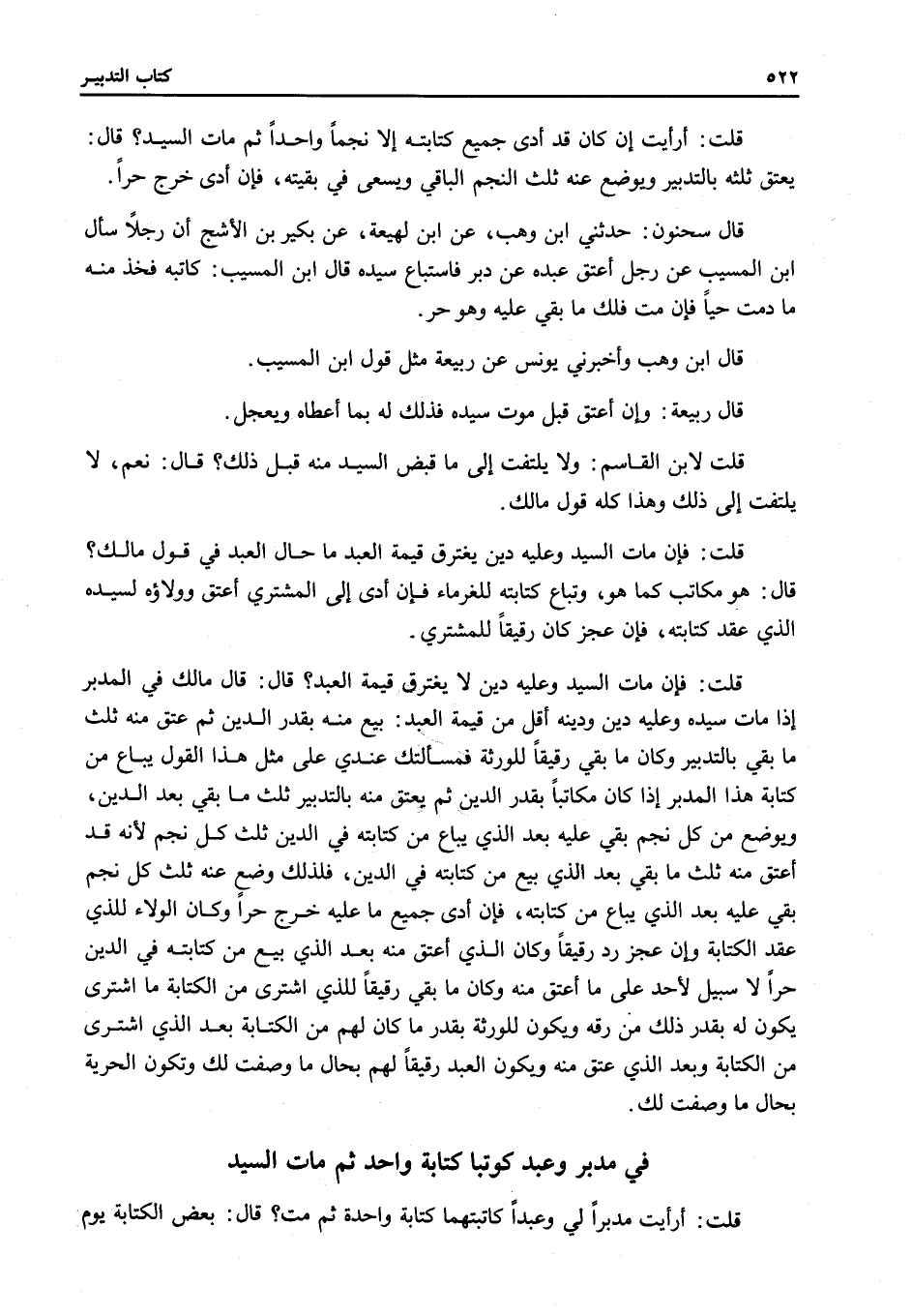 قَالَ سَحْنُونٌ: حَدَّثَنِي ابْنُ وَهْبٍ، عَنْ ابْنِ لَهِيعَةَ، عَنْ بُكَيْرِ بْنِ الْأَشَجِّ أَنَّ رَجُلًا سَأَلَ ابْنَ الْمُسَيِّبِ عَنْ رَجُلٍ أَعْتَقَ عَبْدَهُ عَنْ دُبُرٍ فَاسْتَبَاعَ سَيِّدَهُ قَالَ ابْنُ الْمُسَيِّبِ: كَاتِبْهُ فَخُذْ مِنْهُ مَا دُمْت حَيًّا فَإِنْ مِتَّ فَلَكَ مَا بَقِيَ عَلَيْهِ وَهُوَ حُرٌّ.