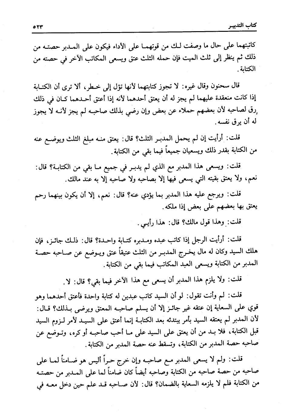 قُلْتُ: وَلِمَ لَا يَسْعَى الْمُدَبَّرُ مَعَ صَاحِبِهِ وَإِنْ خَرَجَ حُرًّا أَلَيْسَ هُوَ ضَامِنًا لِمَا عَلَى صَاحِبِهِ مِنْ حِصَّةِ صَاحِبِهِ مِنْ الْكِتَابَةِ وَصَاحِبُهُ أَيْضًا كَانَ ضَامِنًا لِمَا عَلَى الْمُدَبَّرِ مِنْ حِصَّتِهِ مِنْ الْكِتَابَةِ فَلِمَ لَا يَلْزَمُهُ السِّعَايَةُ بِالضَّمَانِ؟