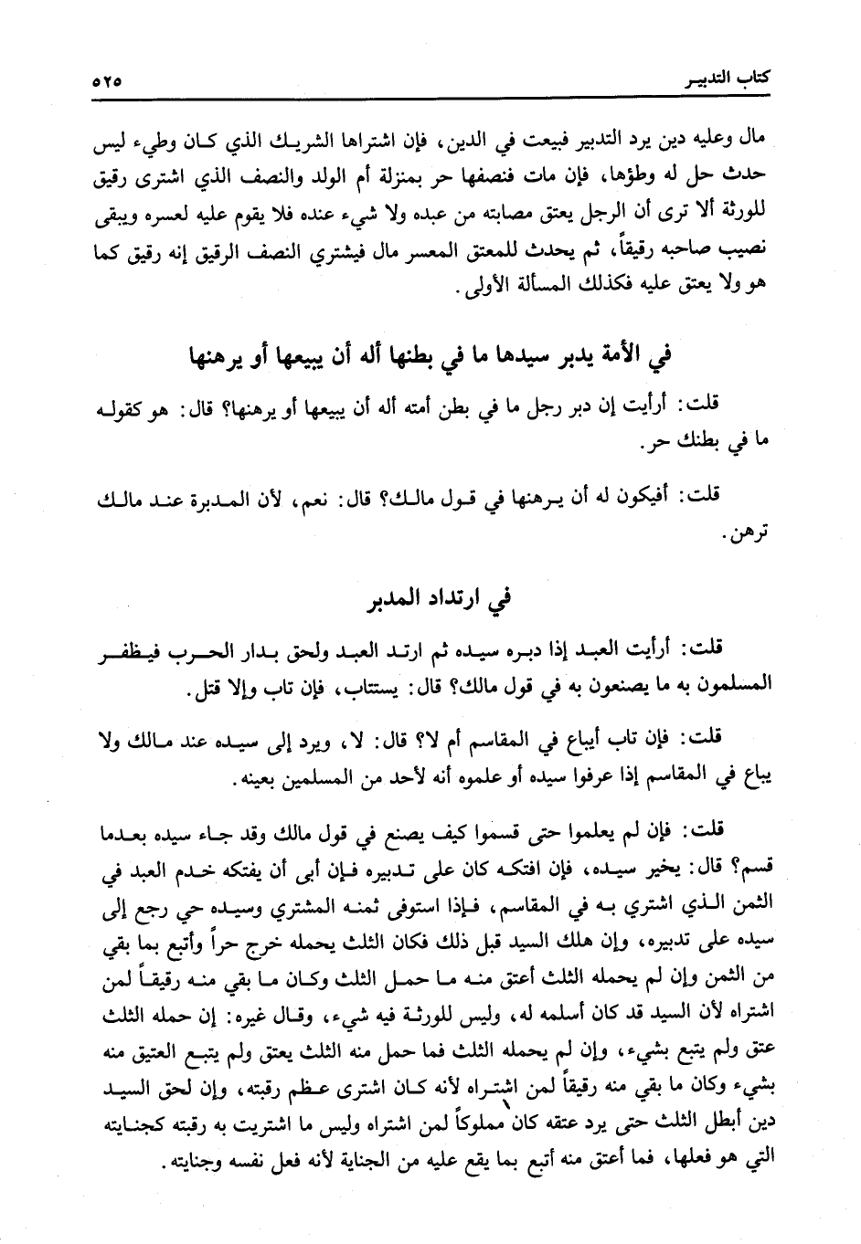 فِي ارْتِدَادِ الْمُدَبَّرِ قُلْتُ: أَرَأَيْتَ الْعَبْدَ إذَا دَبَّرَهُ سَيِّدُهُ ثُمَّ ارْتَدَّ الْعَبْدُ وَلَحِقَ بِدَارِ الْحَرْبِ فَيَظْفَرُ الْمُسْلِمُونَ بِهِ مَا يَصْنَعُونَ بِهِ فِي قَوْلِ مَالِكٍ؟