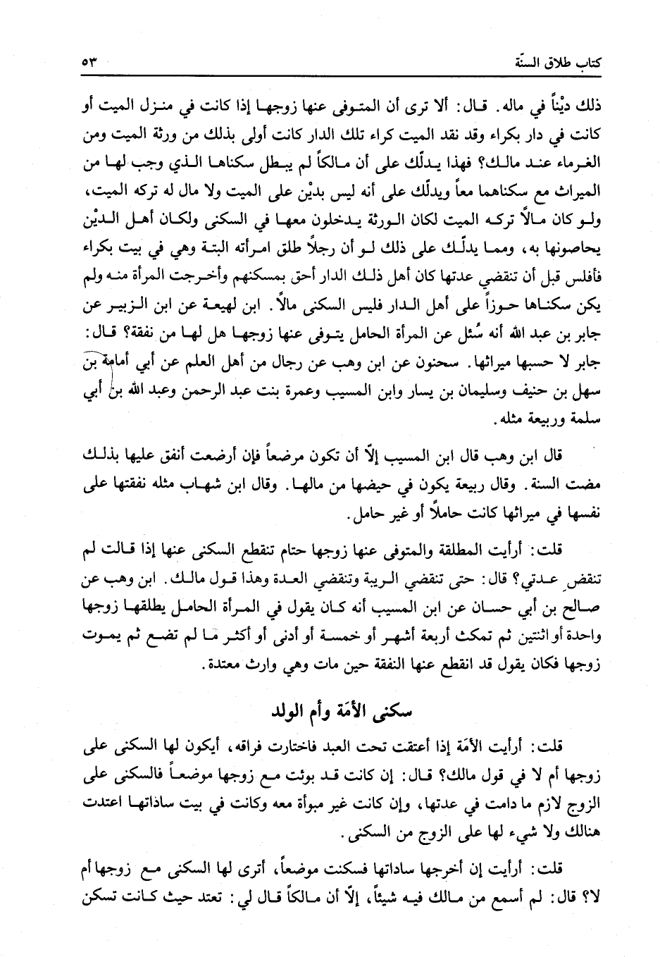 قَالَ: أَلَا تَرَى أَنَّ الْمُتَوَفَّى عَنْهَا زَوْجُهَا إذَا كَانَتْ فِي مَنْزِلِ الْمَيِّتِ أَوْ كَانَتْ فِي دَارٍ بِكِرَاءٍ وَقَدْ نَقَدَ الْمَيِّتُ كِرَاءَ تِلْكَ الدَّارِ كَانَتْ أَوْلَى بِذَلِكَ مِنْ وَرَثَةِ الْمَيِّتِ وَمِنْ الْغُرَمَاءِ عِنْدَ مَالِكٍ؟ فَهَذَا يَدُلُّكَ عَلَى أَنَّ مَالِكًا لَمْ يُبْطِلْ سُكْنَاهَا الَّذِي وَجَبَ لَهَا مِنْ الْمِيرَاثِ مَعَ سُكْنَاهُمَا مَعًا، وَيَدُلُّكَ عَلَى أَنَّهُ لَيْسَ بِدَيْنٍ عَلَى الْمَيِّتِ وَلَا مَالٍ لَهُ تَرَكَهُ الْمَيِّتُ، وَلَوْ كَانَ مَالًا تَرَكَهُ الْمَيِّتُ لَكَانَ الْوَرَثَةُ يَدْخُلُونَ مَعَهَا فِي السُّكْنَى وَلَكَانَ أَهْلُ الدَّيْنِ يُحَاصُّونَهَا بِهِ، وَمِمَّا يَدُلُّكَ عَلَى ذَلِكَ لَوْ أَنَّ رَجُلًا طَلَّقَ امْرَأَتَهُ أَلْبَتَّةَ وَهِيَ فِي بَيْتٍ بِكِرَاءٍ فَأَفْلَسَ قَبْلَ أَنْ تَنْقَضِيَ عِدَّتُهَا كَانَ أَهْلُ ذَلِكَ الدَّارِ أَحَقَّ بِمَسْكَنِهِمْ وَأُخْرِجَتْ الْمَرْأَةُ مِنْهُ وَلَمْ يَكُنْ سُكْنَاهَا حَوْزًا عَلَى أَهْلِ الدَّارِ فَلَيْسَ السُّكْنَى مَالًا ابْنُ لَهِيعَةَ عَنْ ابْنِ الزُّبَيْرِ عَنْ جَابِرِ بْنِ عَبْدِ اللَّهِ أَنَّهُ سُئِلَ عَنْ الْمَرْأَةِ الْحَامِلِ يُتَوَفَّى عَنْهَا زَوْجُهَا هَلْ لَهَا مِنْ نَفَقَةٍ؟ قَالَ: جَابِرٌ لَا حَسْبُهَا مِيرَاثُهَا سَحْنُونٌ عَنْ ابْنِ وَهْبٍ عَنْ رِجَالٍ مِنْ أَهْلِ الْعِلْمِ عَنْ أَبِي أُمَامَةَ بْنِ سَهْلِ بْنِ حُنَيْفٍ وَسُلَيْمَانَ بْنِ يَسَارٍ وَابْنِ الْمُسَيِّبِ وَعَمْرَةَ بِنْتِ عَبْدِ الرَّحْمَنِ وَعَبْدِ اللَّهِ بْنِ أَبِي سَلَمَةَ وَرَبِيعَةَ مِثْلُهُ.